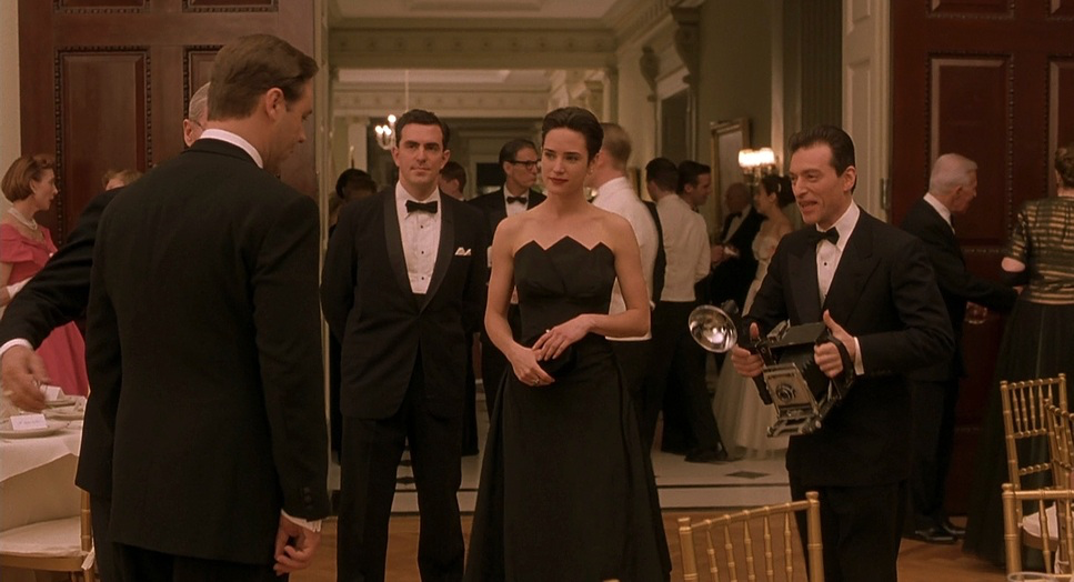 The introduction of his imagined companions uses composition subtly. When William Parcher first appears, he’s partially concealed, almost like a figure emerging from the periphery of Nash’s subconscious. Similarly, the way Charles is framed sometimes appearing suddenly, or exiting a room through a door that doesn’t quite behave correctly creates a subliminal sense of unreality. The film also uses depth cues masterfully. In crowded scenes, Nash might be sharply focused in the foreground with the background blurred, isolating him. Conversely, when his paranoia intensifies, compositions become layered with elements suggesting hidden figures or surveillance, deepening our shared sense of unease.