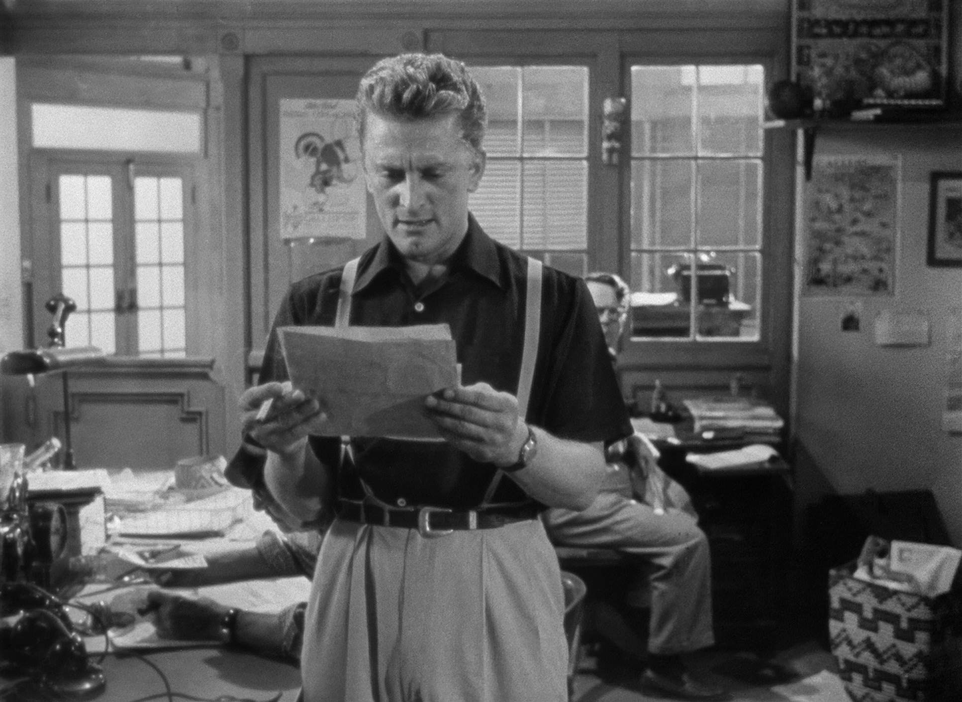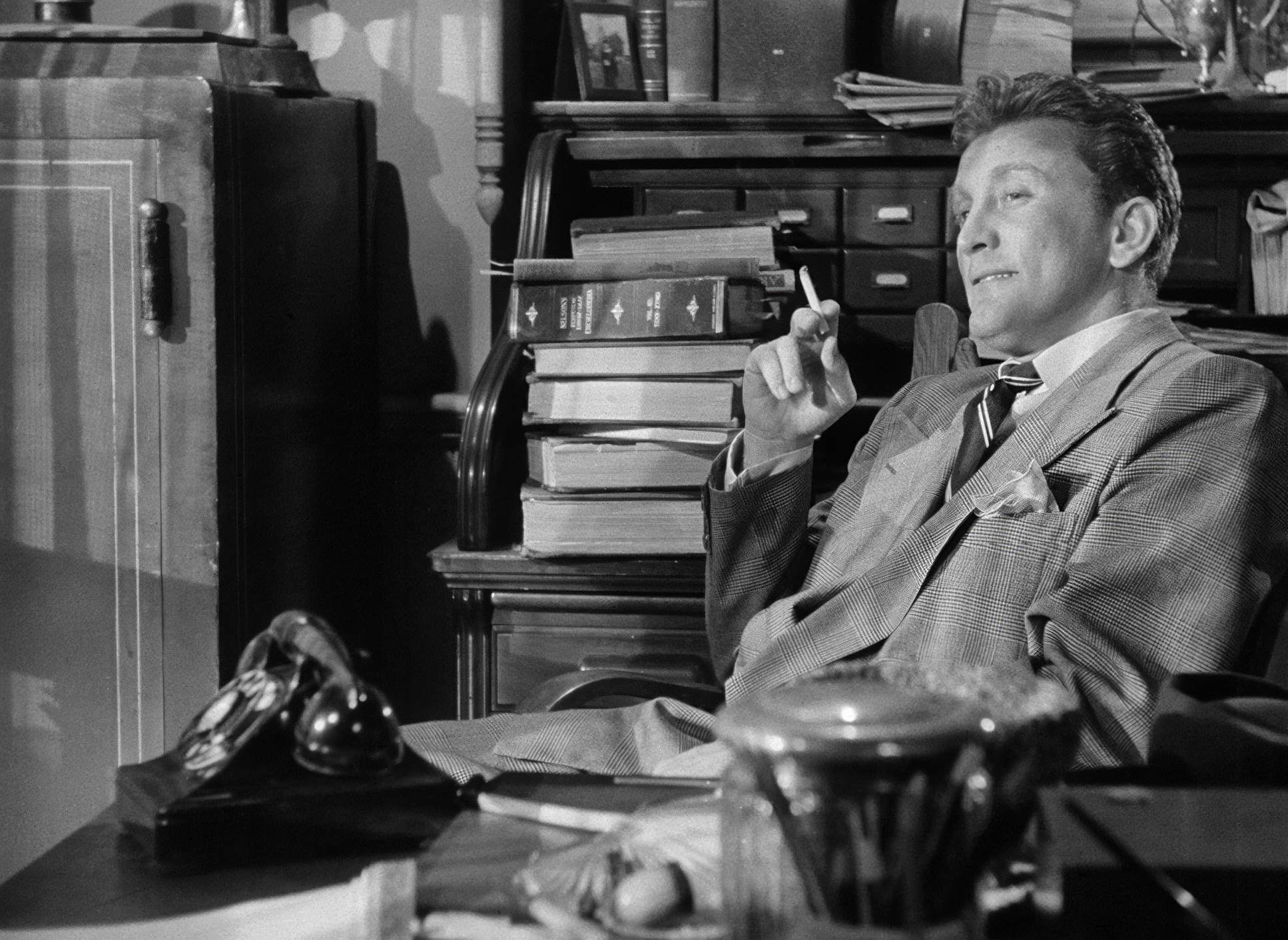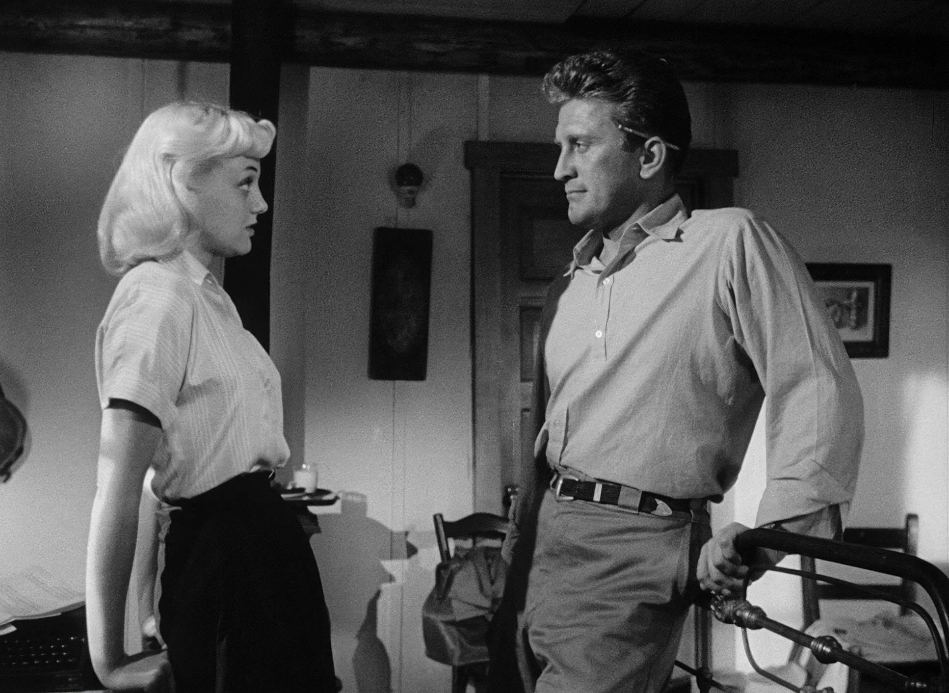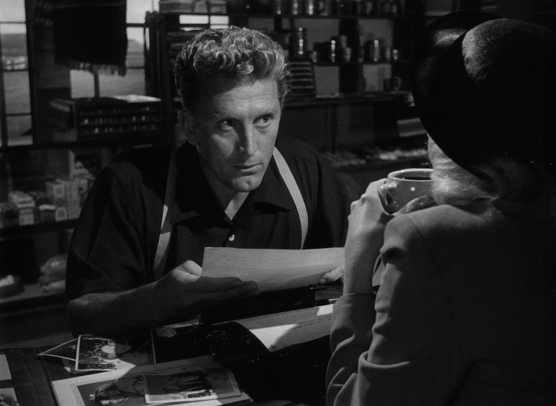 The blocking here is incredibly strong. Kirk Douglas has this “riveting” presence, and the camera treats him like the sun that everyone else orbits. Wilder stages the interactions between Tatum and Lorraine (Jan Sterling) with a clinical coldness they’re rarely in a warm two-shot; they’re usually physically separated by the frame, highlighting the transactional nature of their “relationship.”