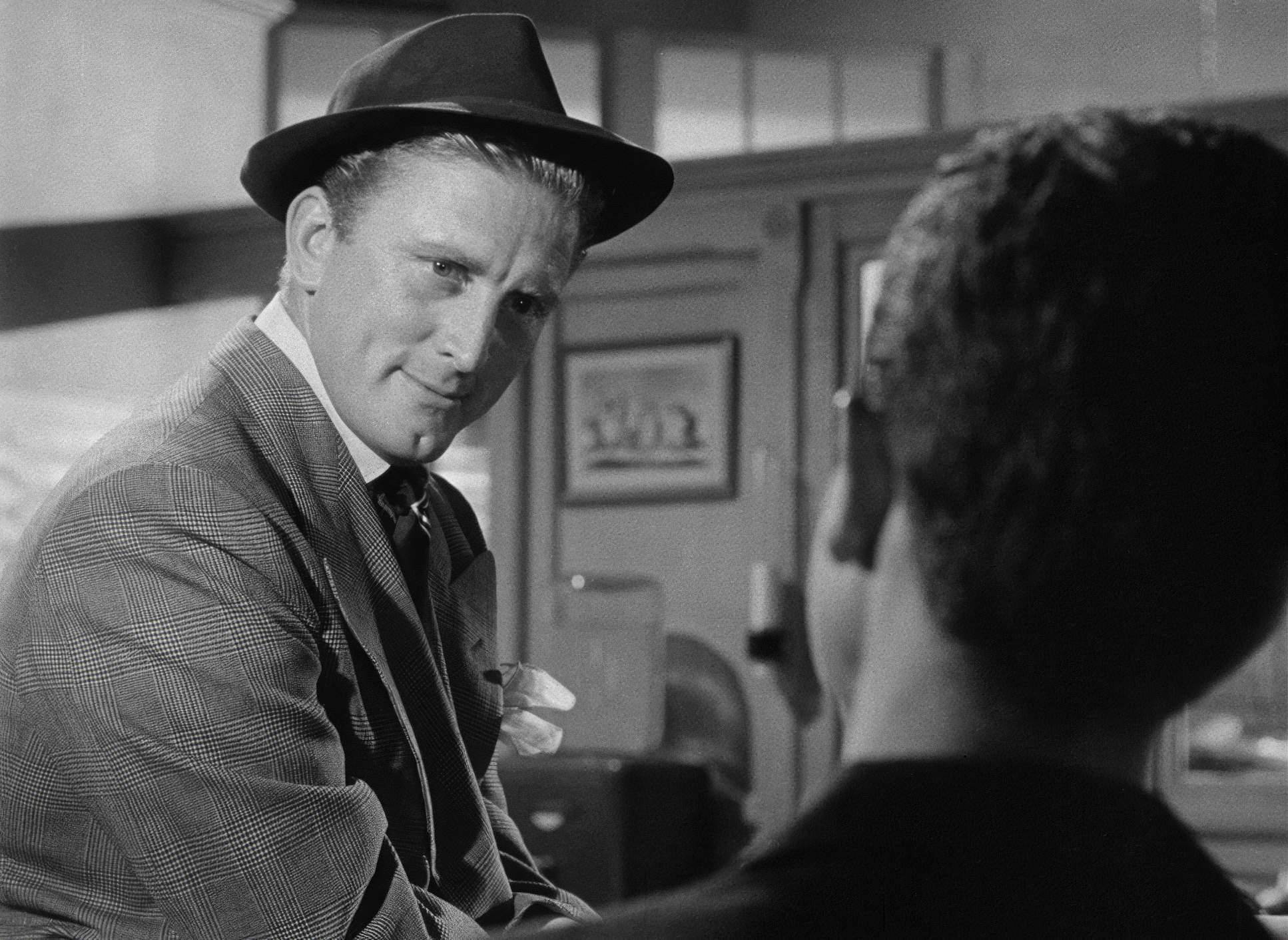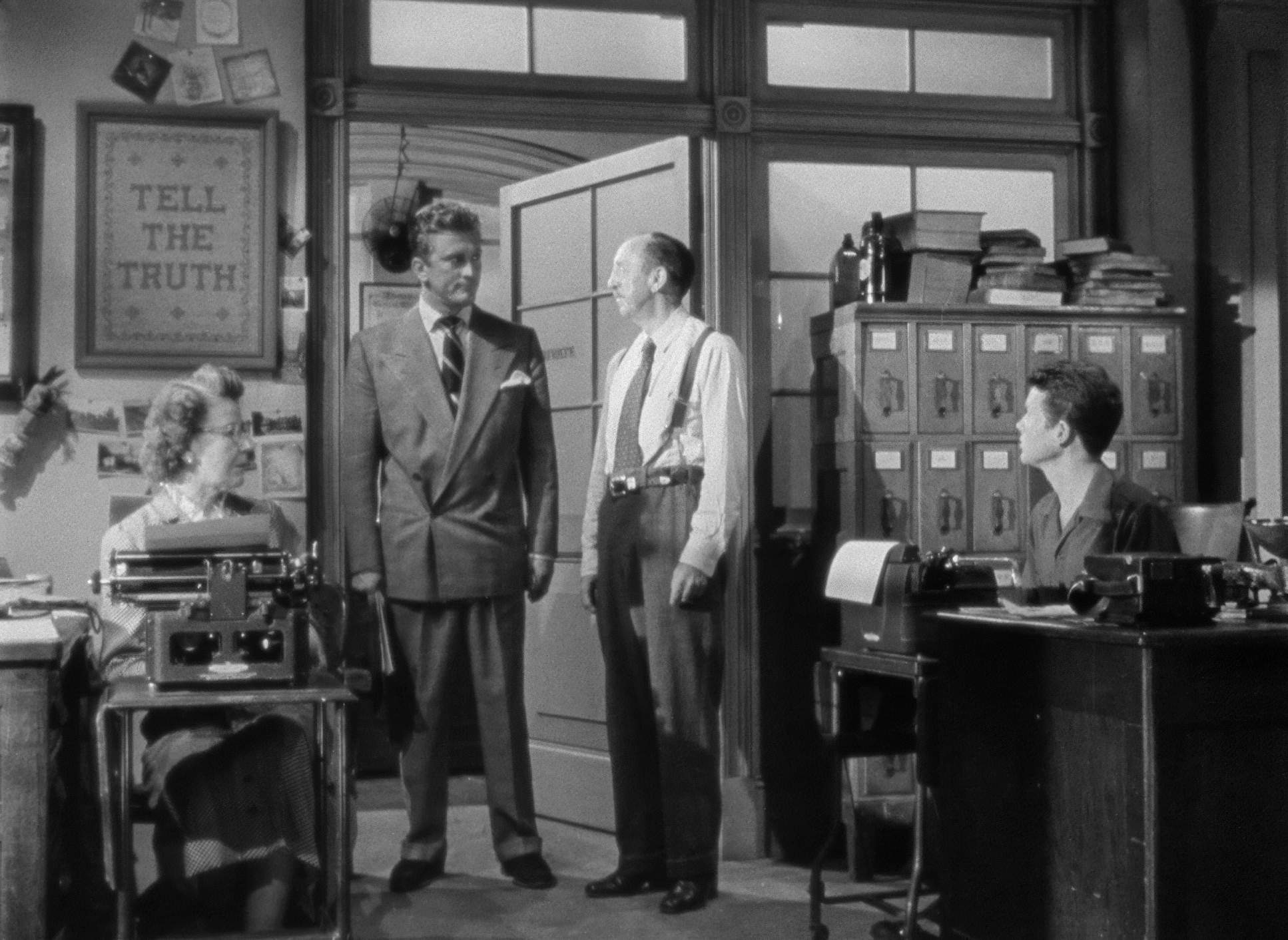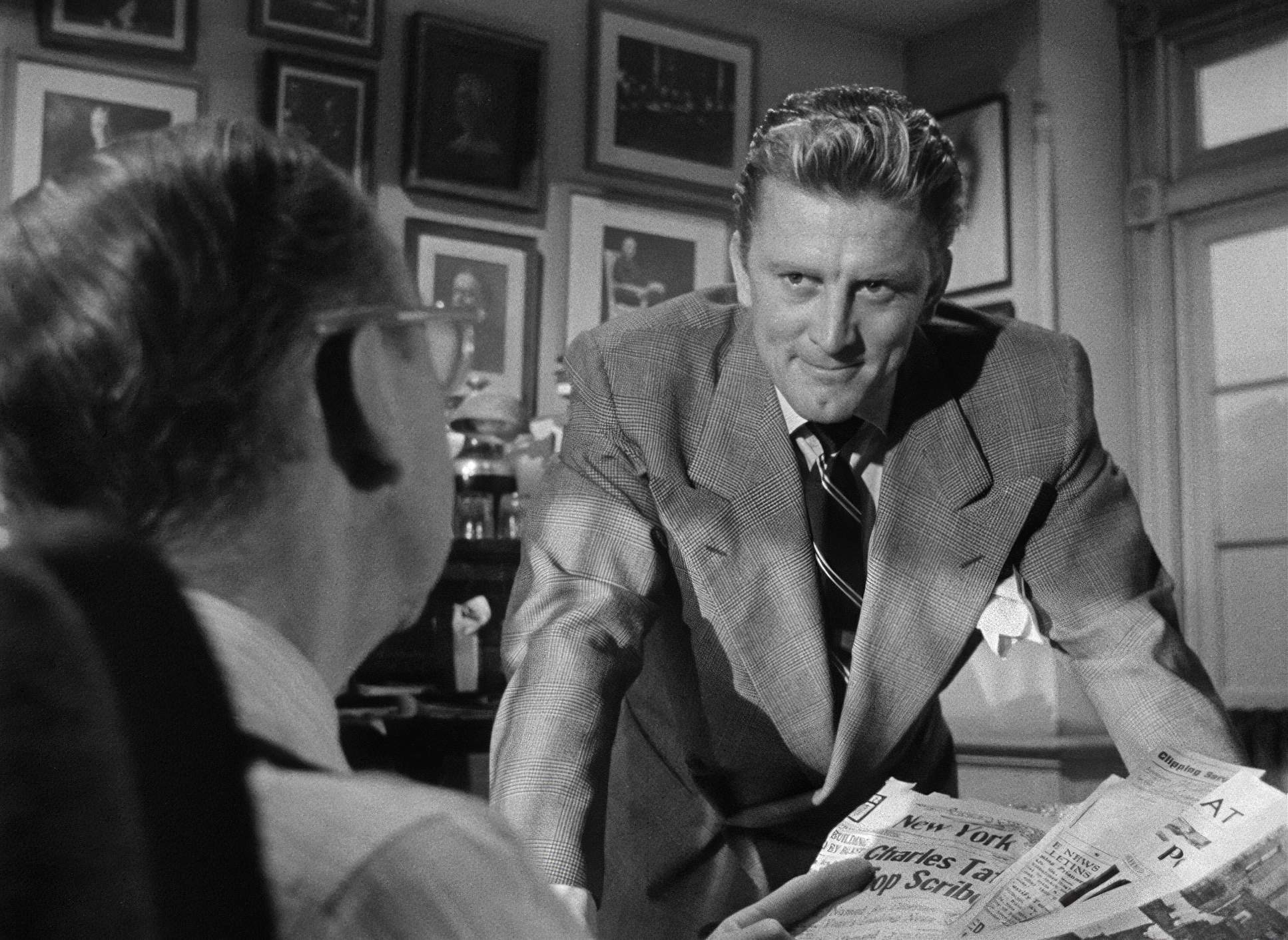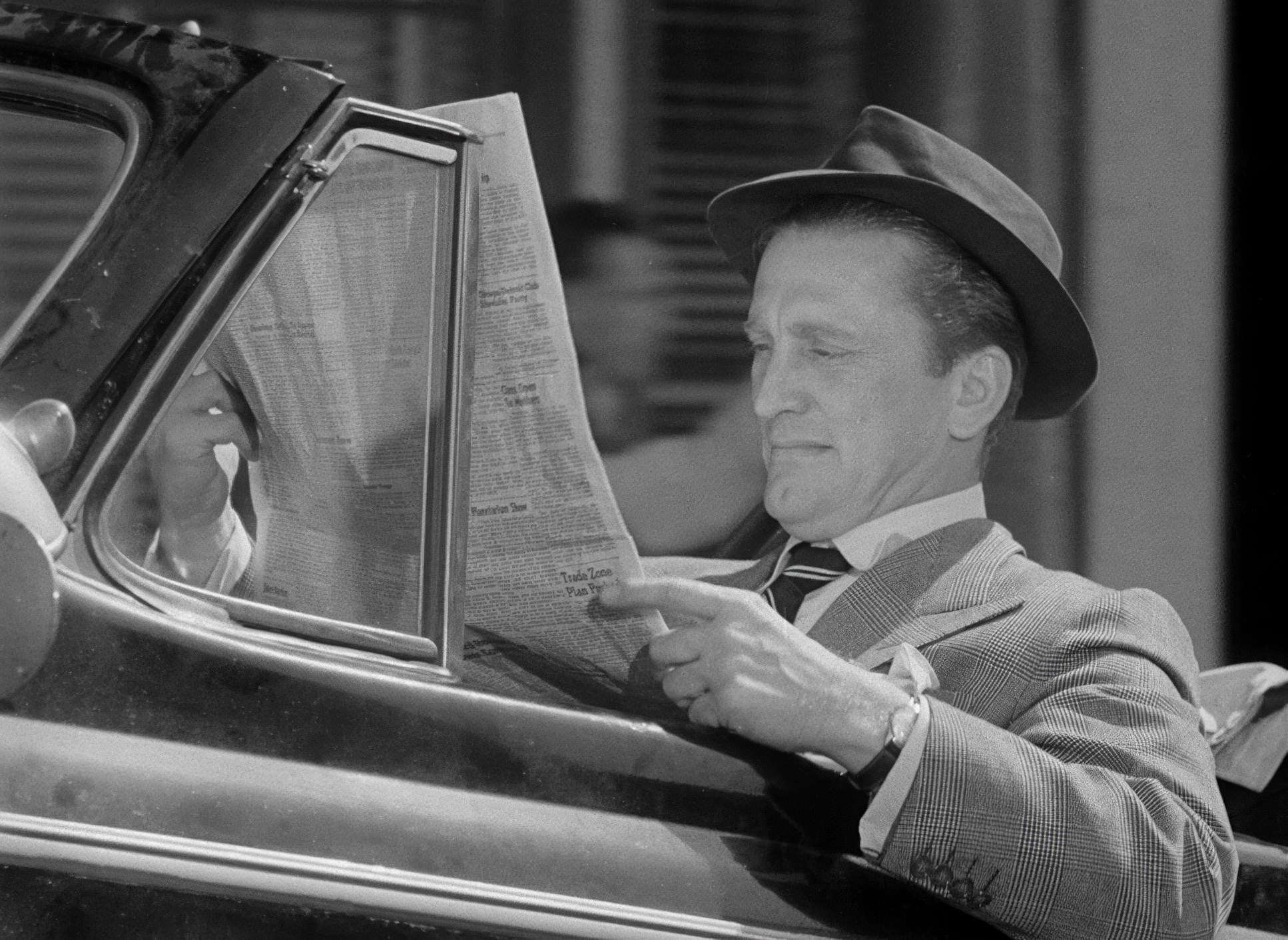 The blocking here is incredibly strong. Kirk Douglas has this “riveting” presence, and the camera treats him like the sun that everyone else orbits. Wilder stages the interactions between Tatum and Lorraine (Jan Sterling) with a clinical coldness they’re rarely in a warm two-shot; they’re usually physically separated by the frame, highlighting the transactional nature of their “relationship.”
