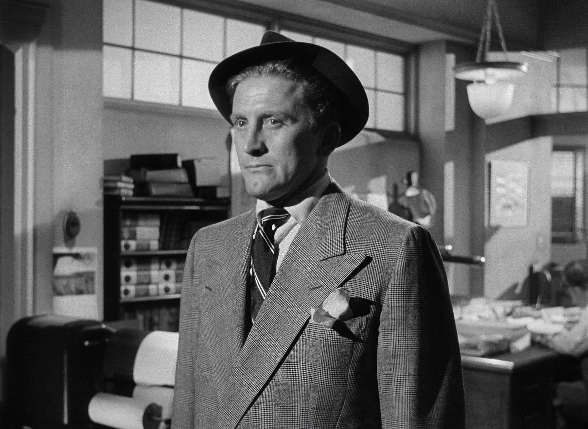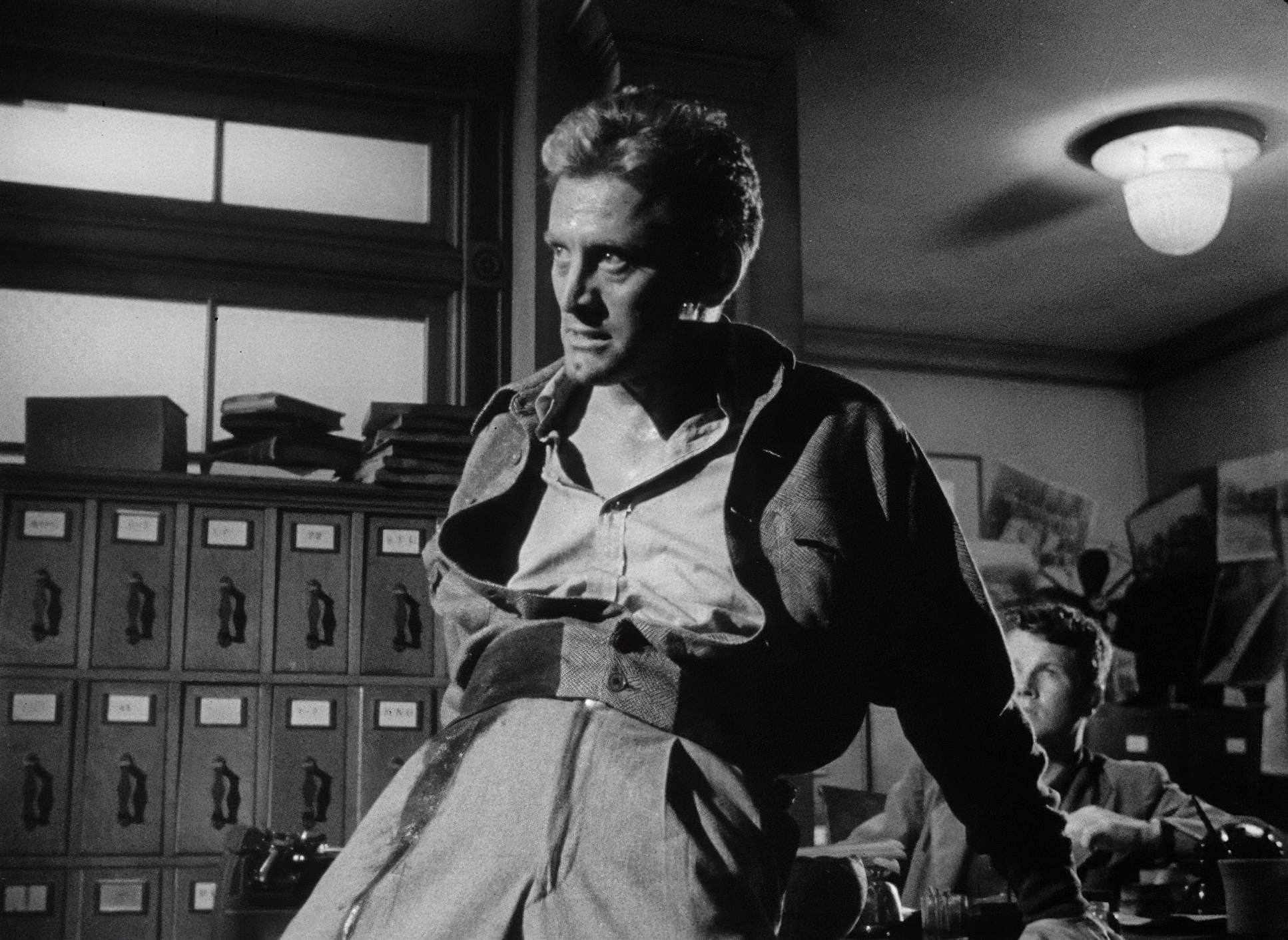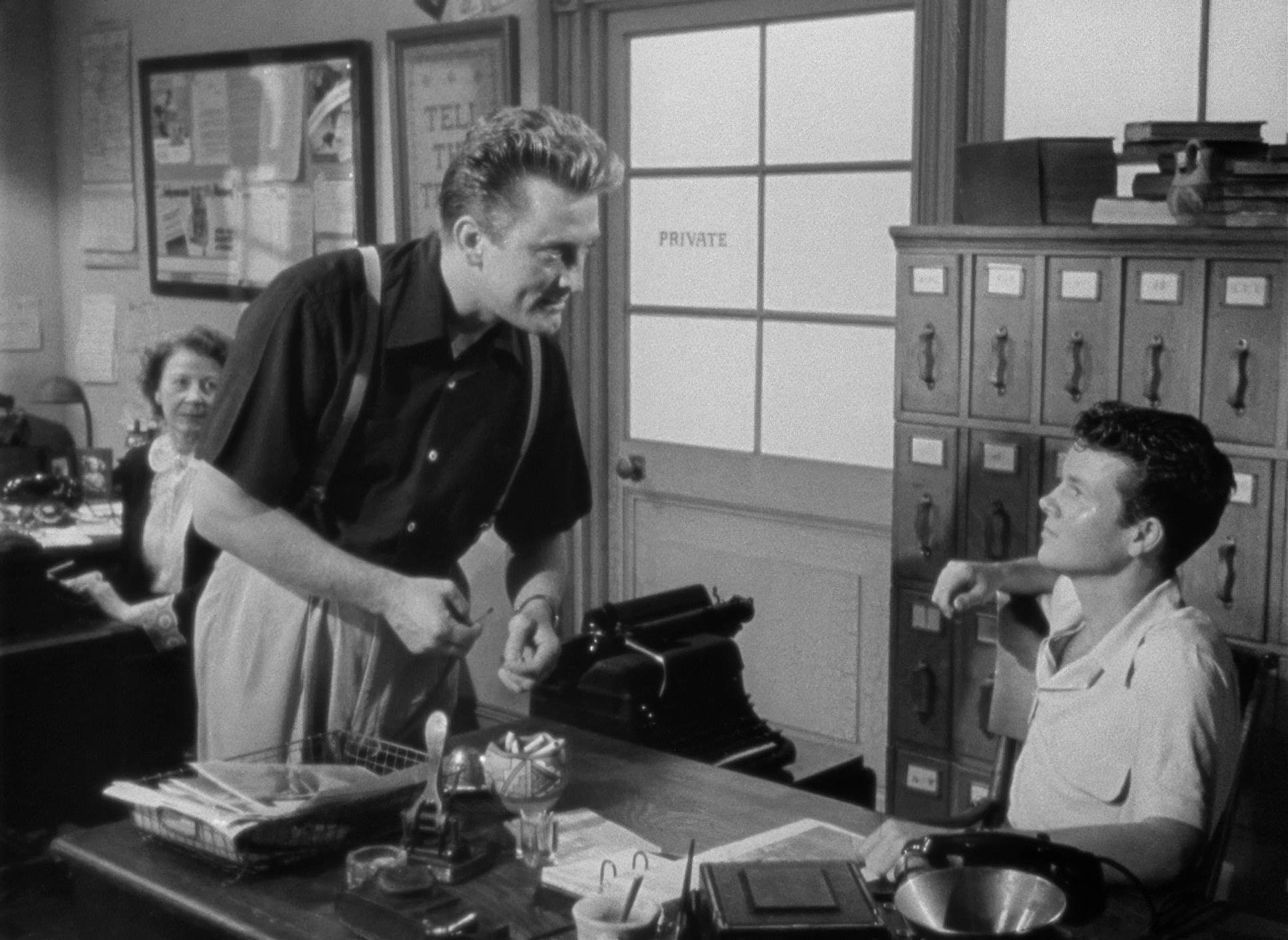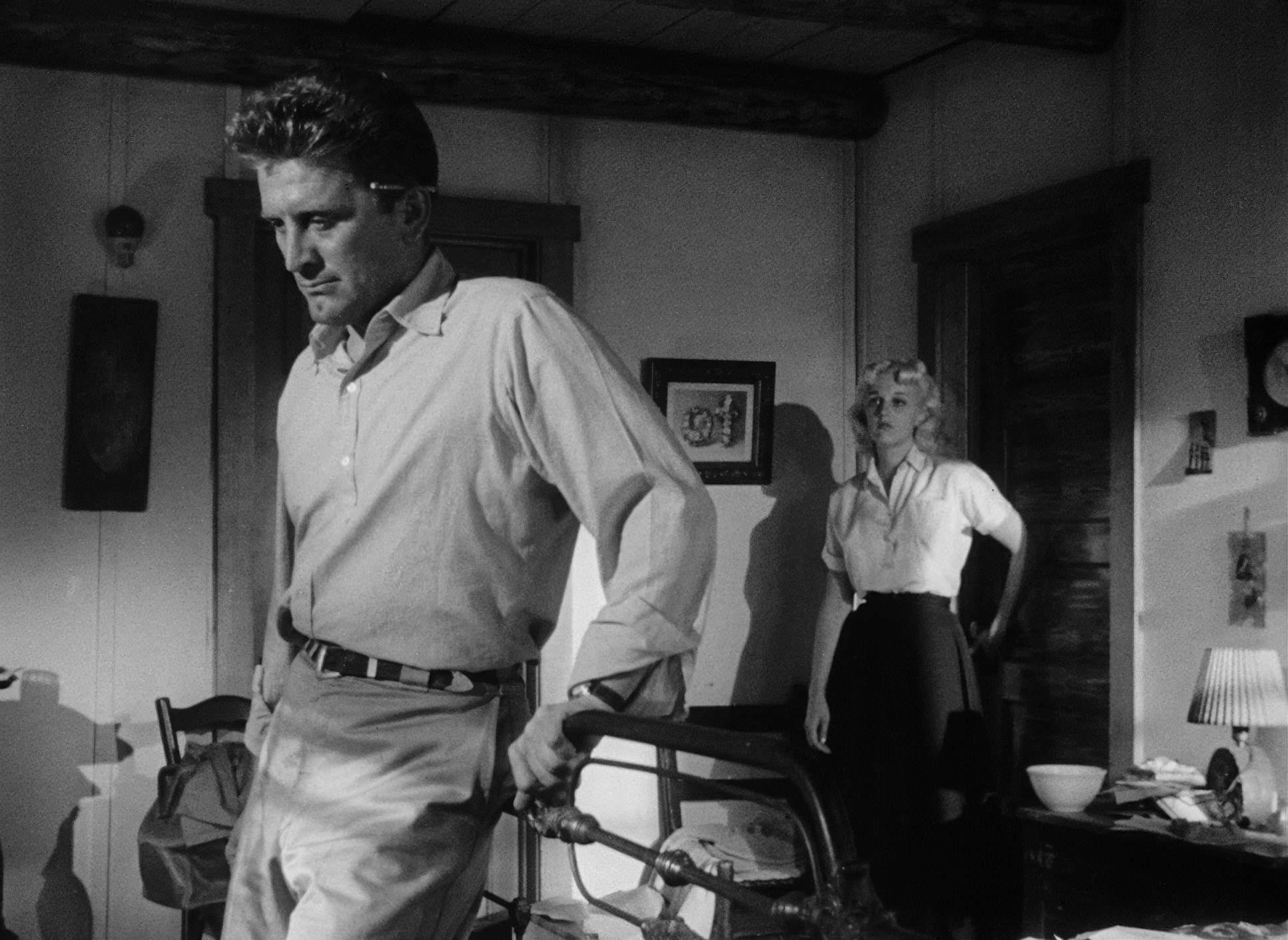 The blocking here is incredibly strong. Kirk Douglas has this “riveting” presence, and the camera treats him like the sun that everyone else orbits. Wilder stages the interactions between Tatum and Lorraine (Jan Sterling) with a clinical coldness they’re rarely in a warm two-shot; they’re usually physically separated by the frame, highlighting the transactional nature of their “relationship.”