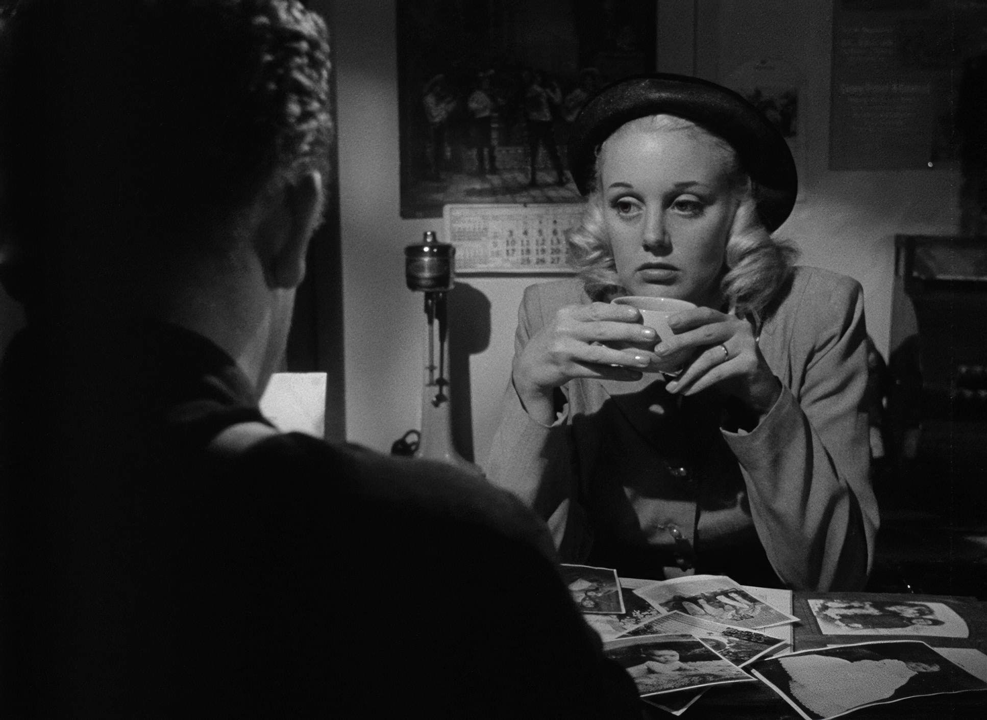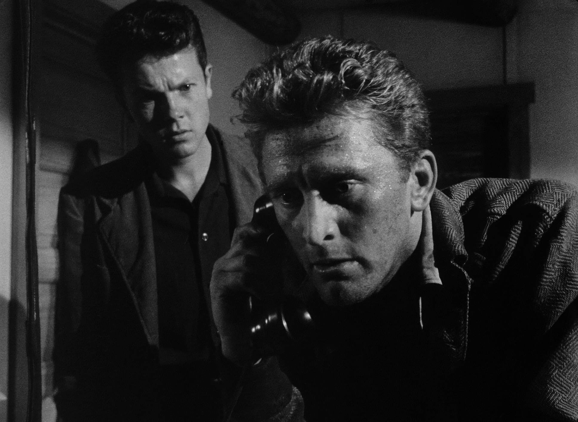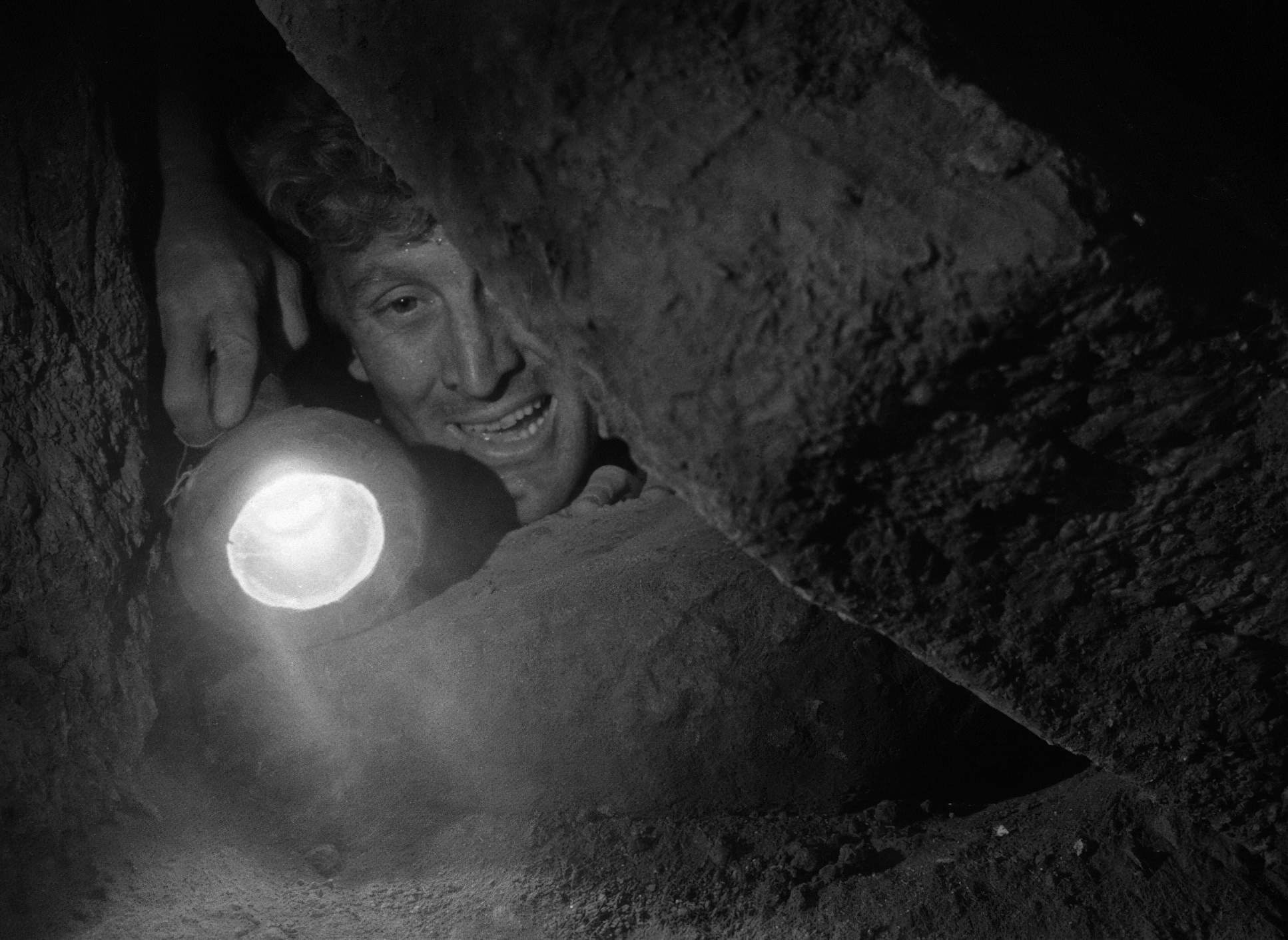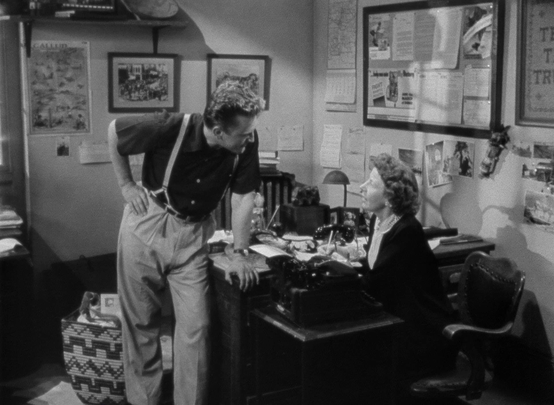 The blocking here is incredibly strong. Kirk Douglas has this “riveting” presence, and the camera treats him like the sun that everyone else orbits. Wilder stages the interactions between Tatum and Lorraine (Jan Sterling) with a clinical coldness they’re rarely in a warm two-shot; they’re usually physically separated by the frame, highlighting the transactional nature of their “relationship.”