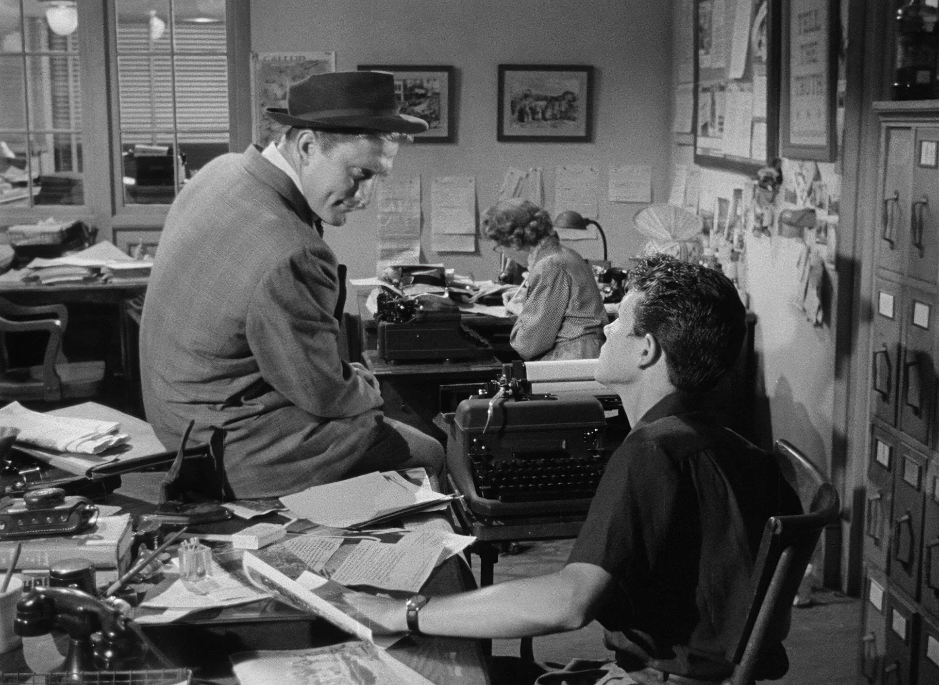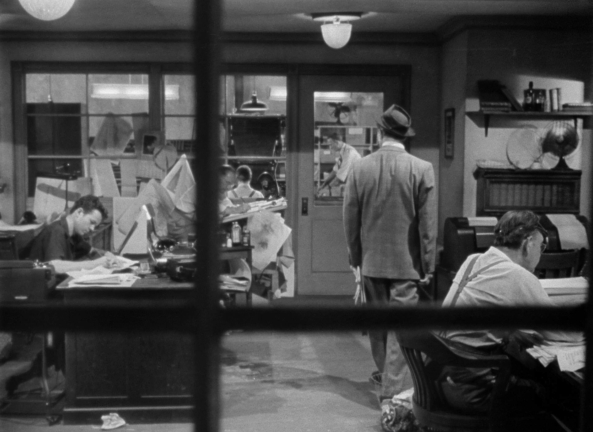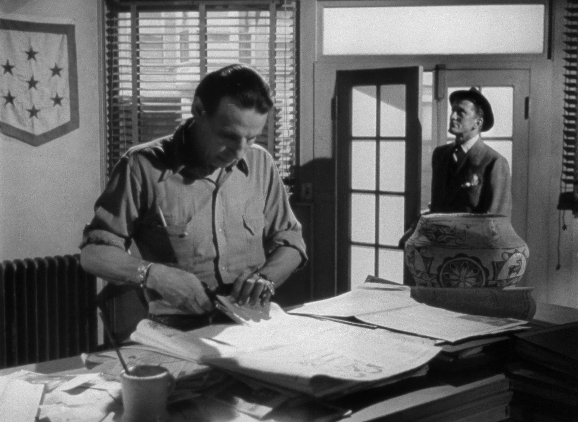 The camera in Ace in the Hole has the energy of a predator. Much of that comes from how it mirrors Chuck Tatum (Kirk Douglas). Tatum is a shark, and the camera is his shadow. In the early scenes, as he’s clawing for his “big break,” the framing is restless panoramic sweeps and quick reframes that create a sense of frantic ambition.