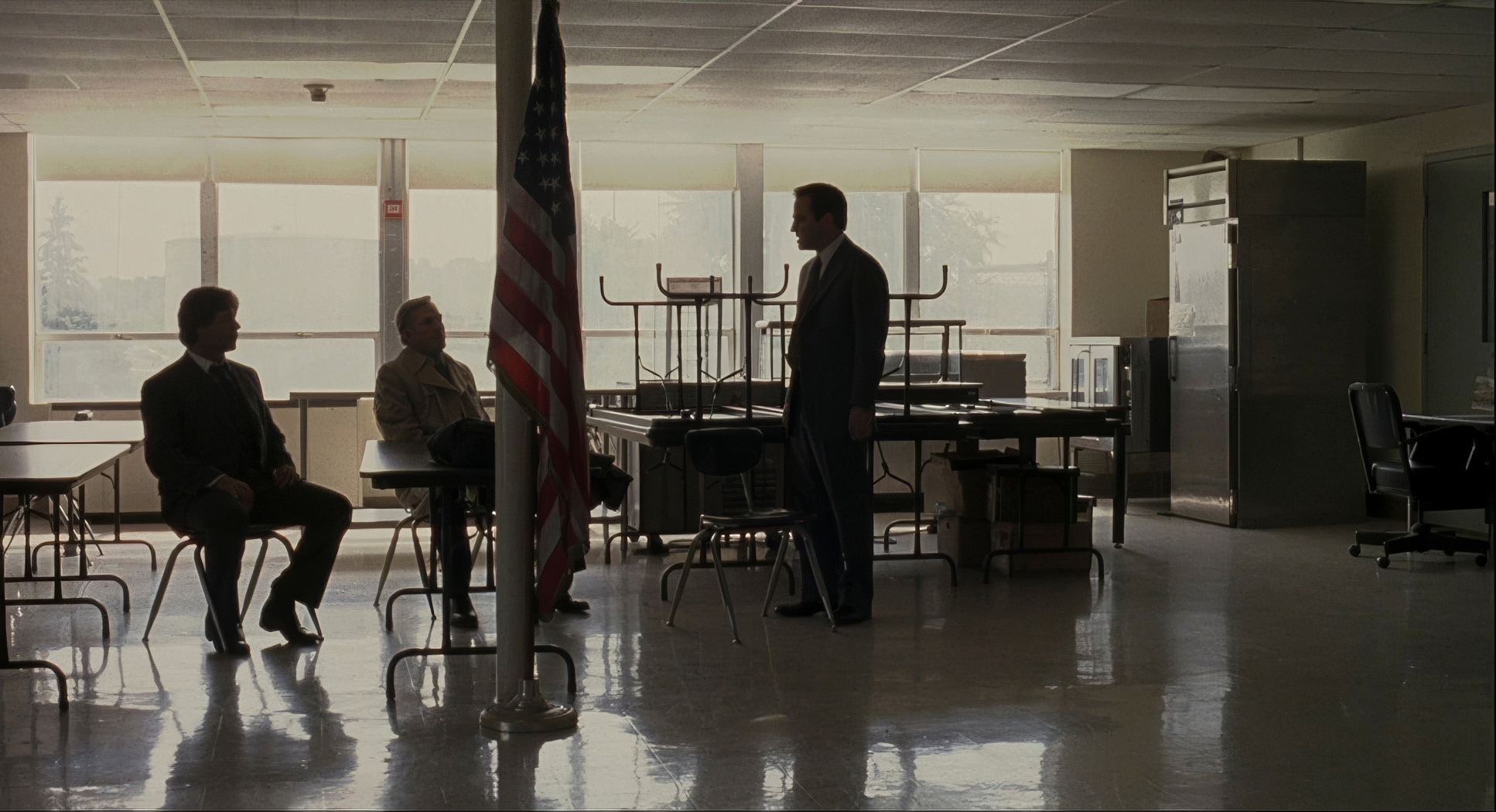 In the urban night scenes, the lighting is high-contrast but “underlit.” Savides wasn’t afraid of the dark. He used deep shadows to convey moral ambiguity, but because of the 5229 stock, those blacks rarely feel “crushed” or empty they have a milky, textured quality that I find much more interesting than pitch-black digital shadows. In Frank’s domestic world, the light gets warmer and softer, creating an aspirational glow that mimics the “American Dream.” However, there’s always a hard edge or a cool shadow nearby, reminding us that this world is built on a foundation of violence. Richie Roberts’s world, by contrast, is often lit with cold, sterile fluorescents, visually trapping him in the bureaucratic grind of the justice system.