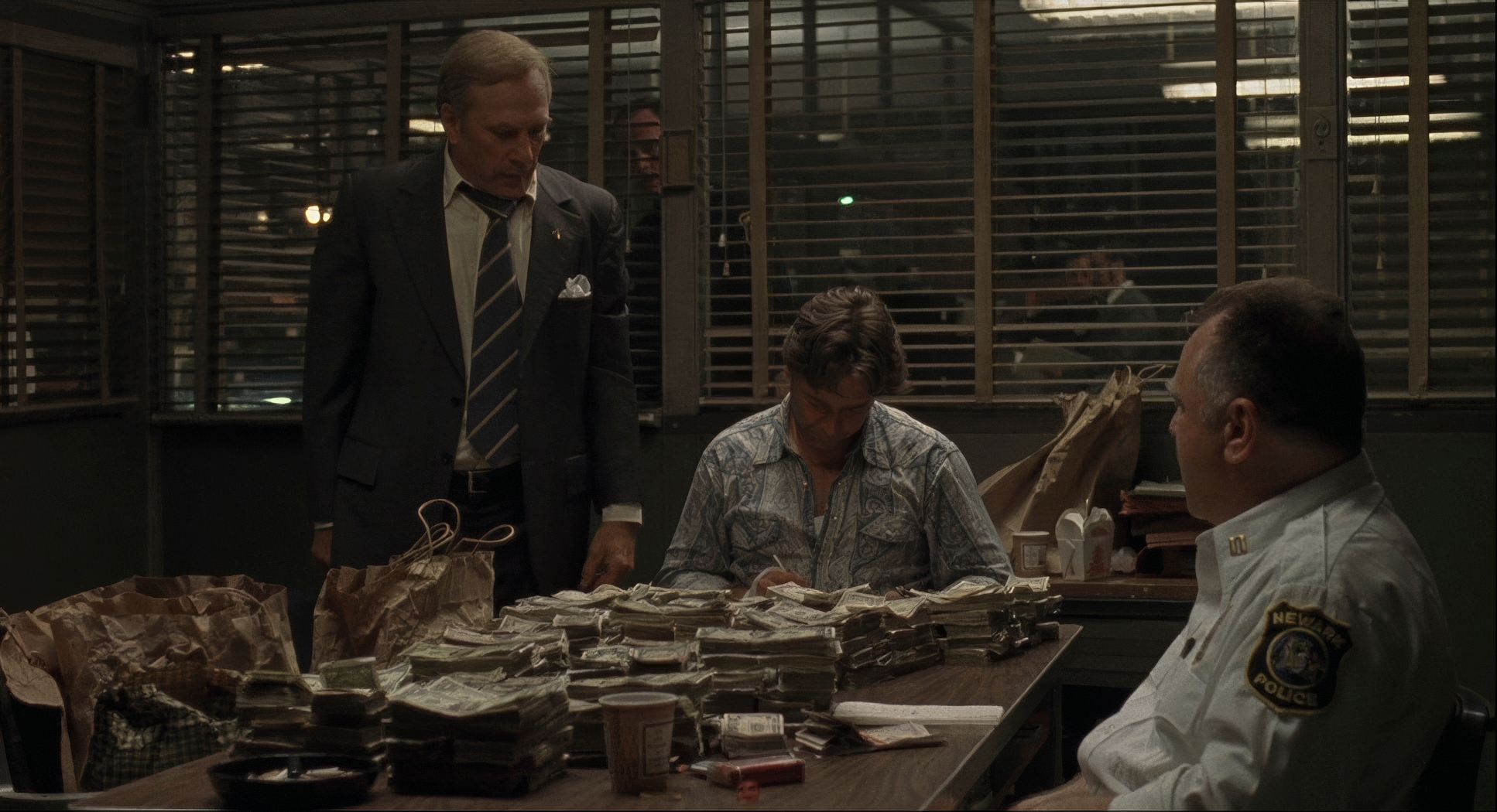 Richie Roberts, however, is often blocked in a state of reactive movement. We see him through “obstacles” bars, glass, or other people symbolizing the corruption he’s trying to punch through. The use of depth of field is also key; Savides uses shallow focus sparingly to isolate characters during moments of internal crisis, while using deeper focus for scenes like the drug-bagging apartment to show the massive scale of Frank’s operation.
