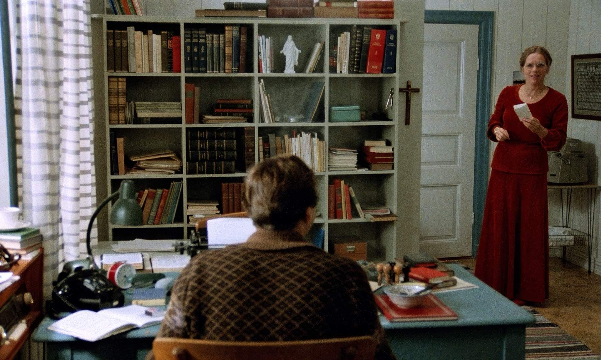 Even in close quarters, the wider shots emphasize the emotional distance. Eva and Charlotte might be in the same room, but the way they are framed suggests a massive chasm between them. Doors and windows are used as barriers or “frames within frames.” For instance, the pastor is often shown as a removed observer, framing his wife from a distance. That negative space around the characters feels heavy it’s laden with all the words they aren’t saying.