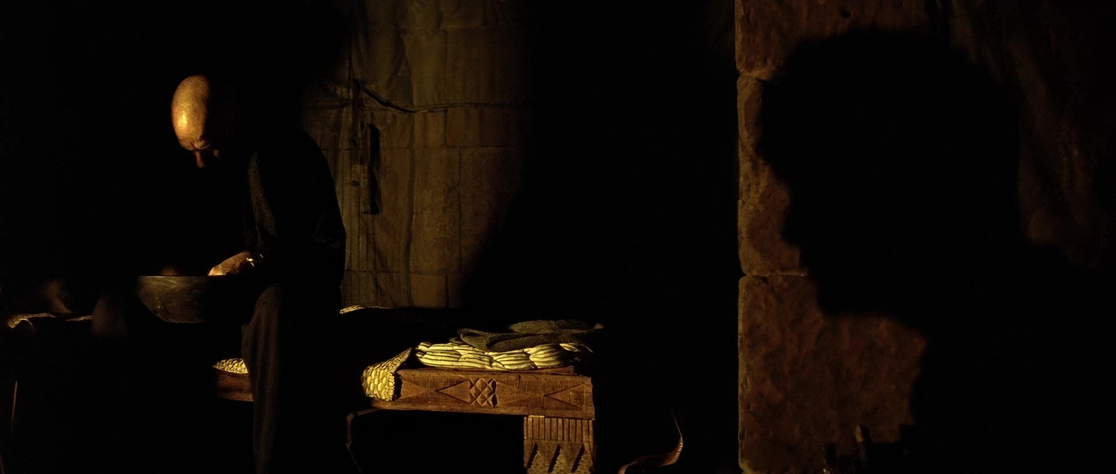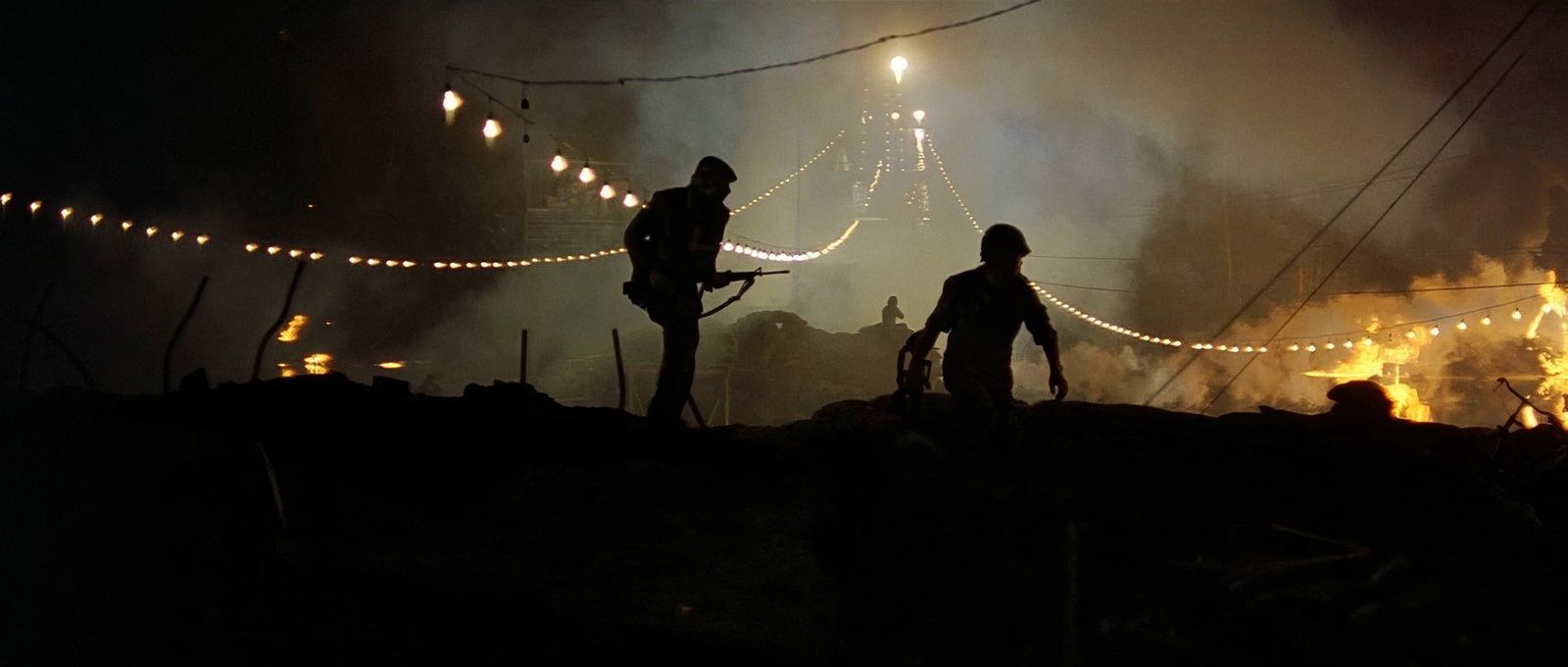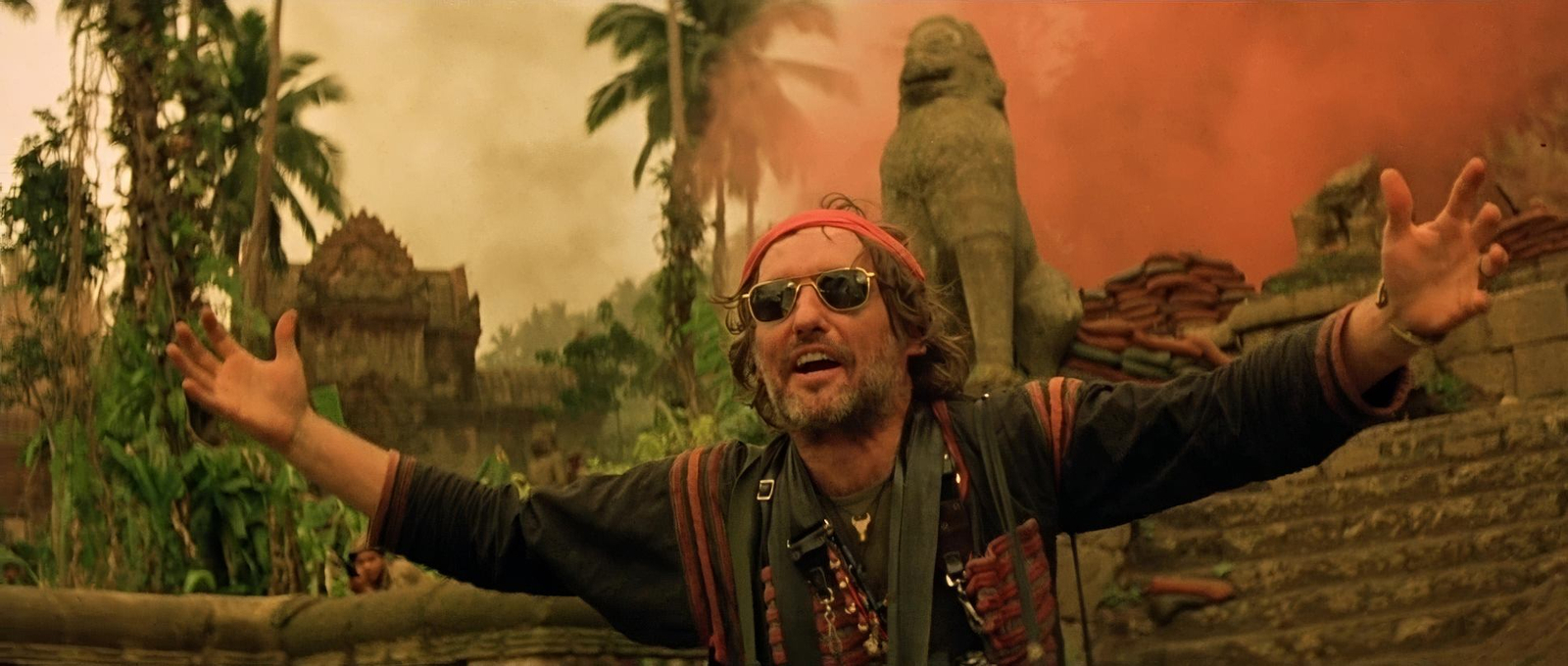 The climax in Kurtz’s compound is a prime example of chiaroscuro at its finest. Kurtz is often half-hidden in shadows, symbolizing his moral ambiguity and estrangement from reason. The use of firelight heightens the primal atmosphere, underscoring that Kurtz has regressed into a state governed by instinct. On the other hand, combat scenes—like the infamous napalm strike—are flooded with blinding light, overwhelming the senses and symbolizing the sheer destructive power of war.