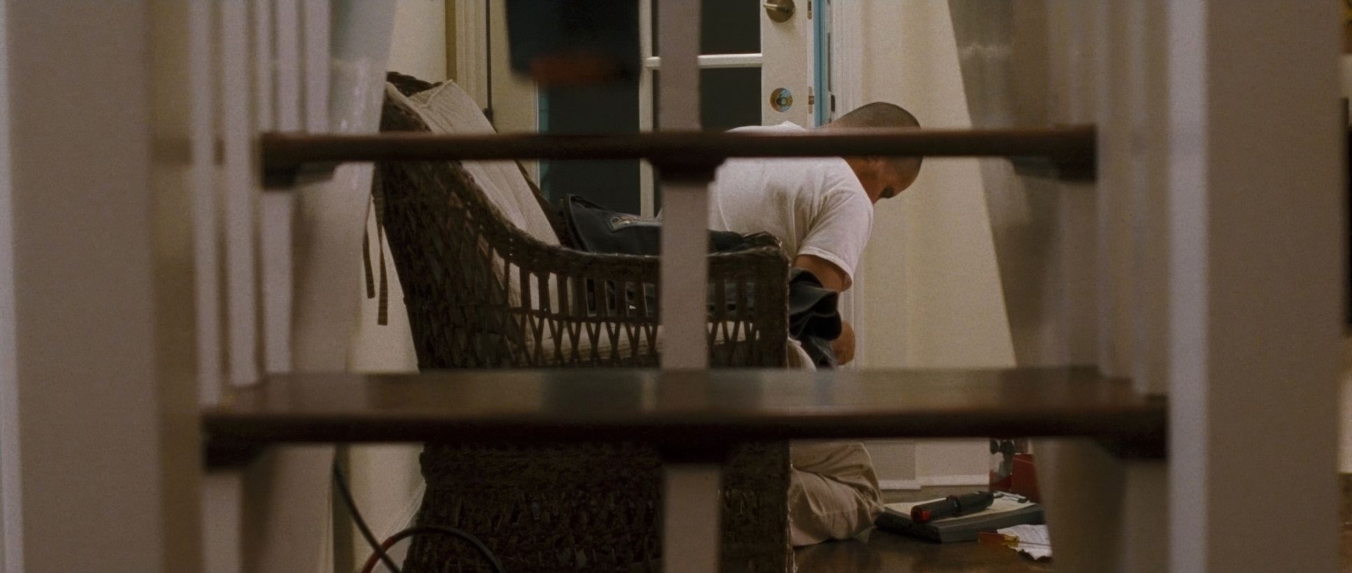 Shooting on 35mm film (likely Kodak Vision or Fuji Eterna) gave them a base of organic grain and rich blacks that digital especially back in ’04 just couldn’t touch. Using the Panavision Millennium series with those Zeiss Super Speeds allowed for a straightforward, realistic perspective.