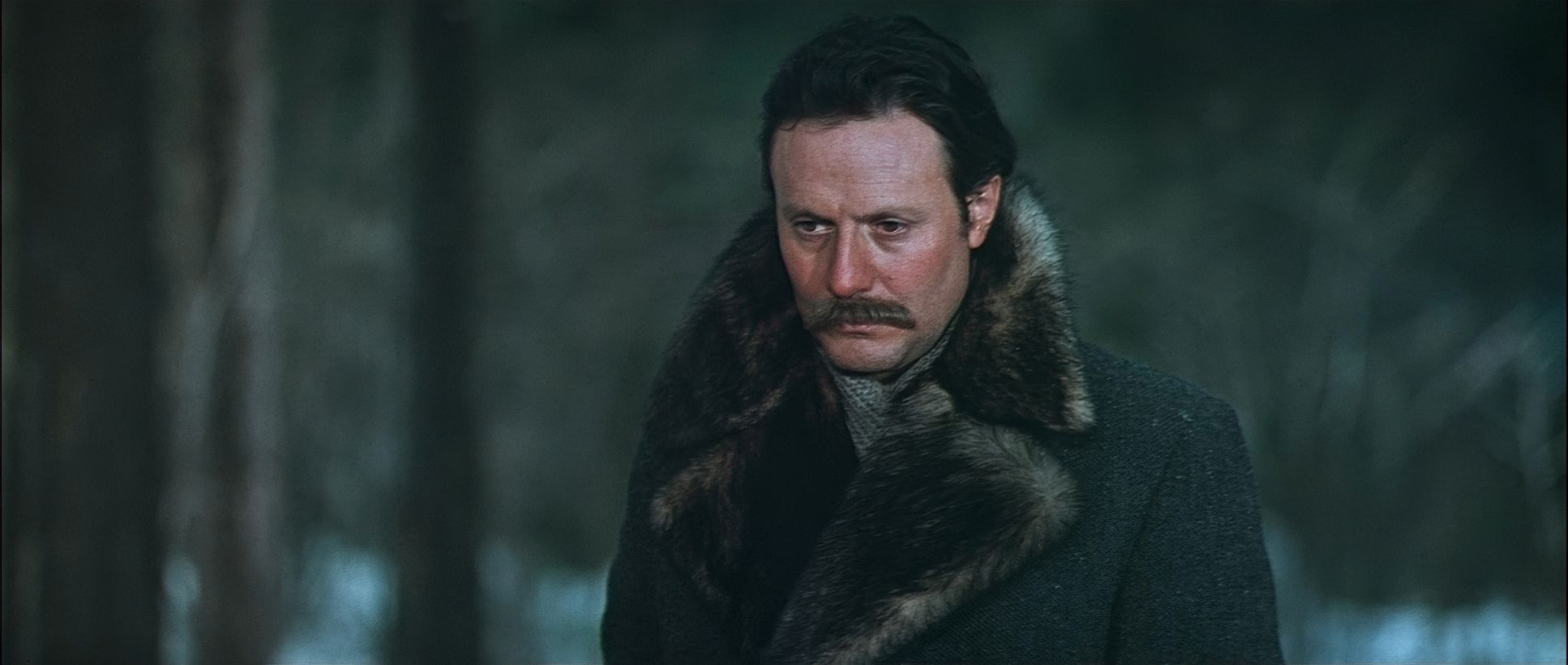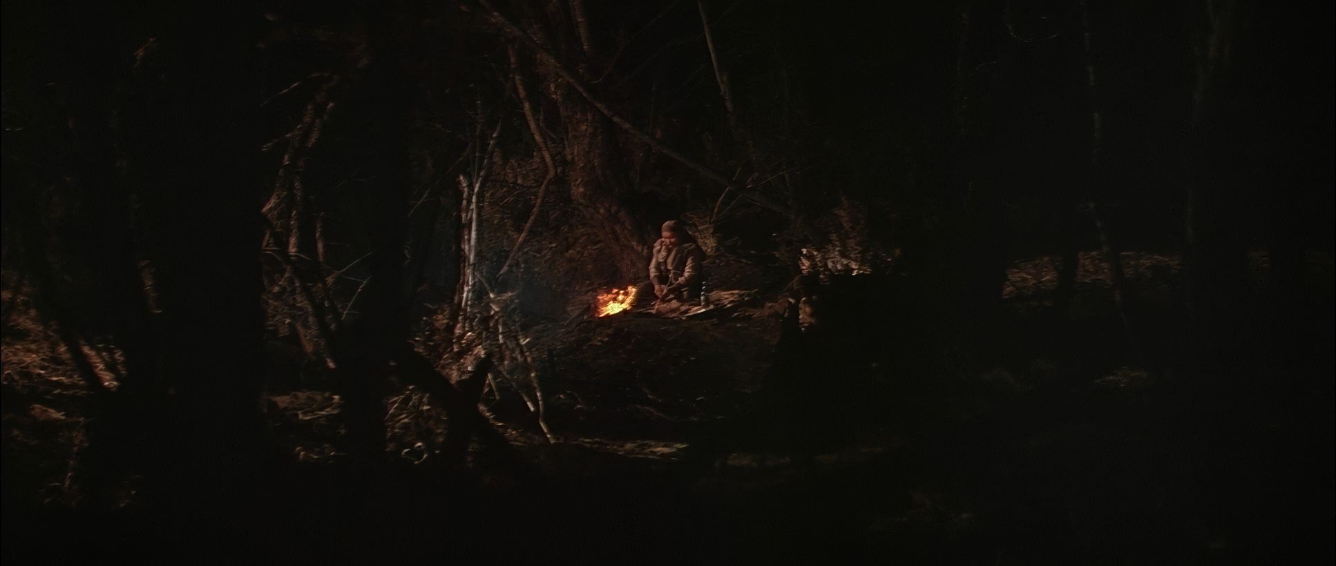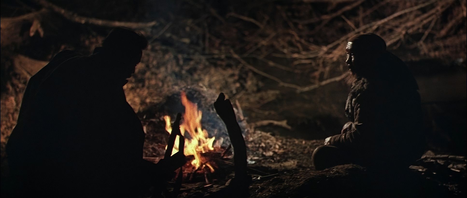 He often uses “frames-within-frames” branches, fog, or snowdrifts to make us feel embedded in the forest. As the bond between the two men grows, the blocking shifts. We move from those distant, isolated frames to more intimate medium shots during the campfire scenes. Some critics argue that certain shots feel “flat” or “lifeless” due to the static camera, but I disagree. As a colorist, I see those static frames as a choice to let the 70mm negative breathe, allowing the viewer to simply be in the environment without the distraction of unnecessary movement.