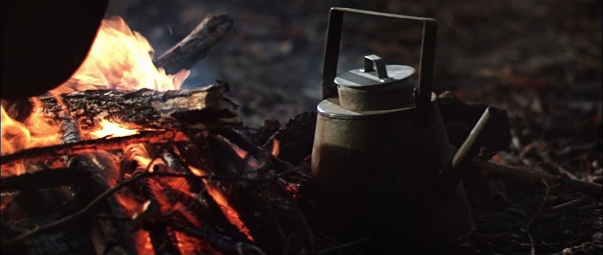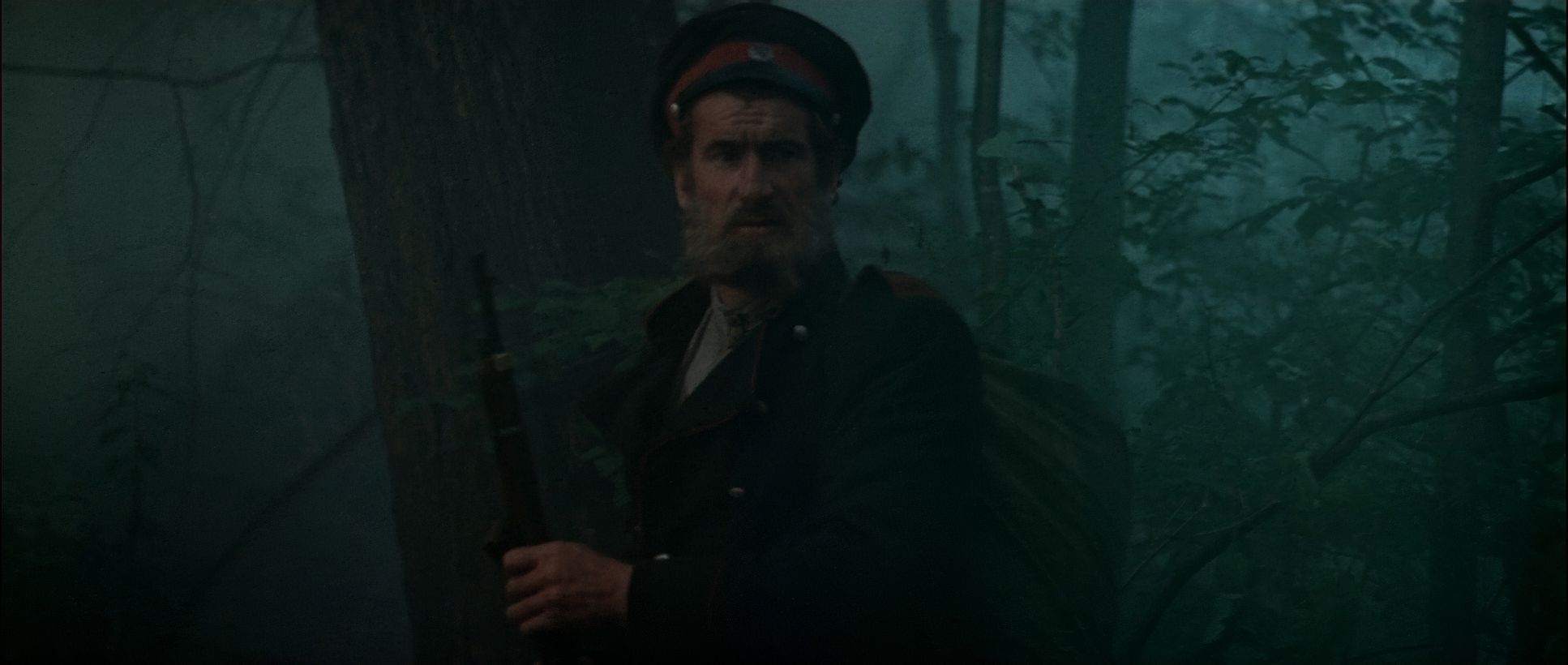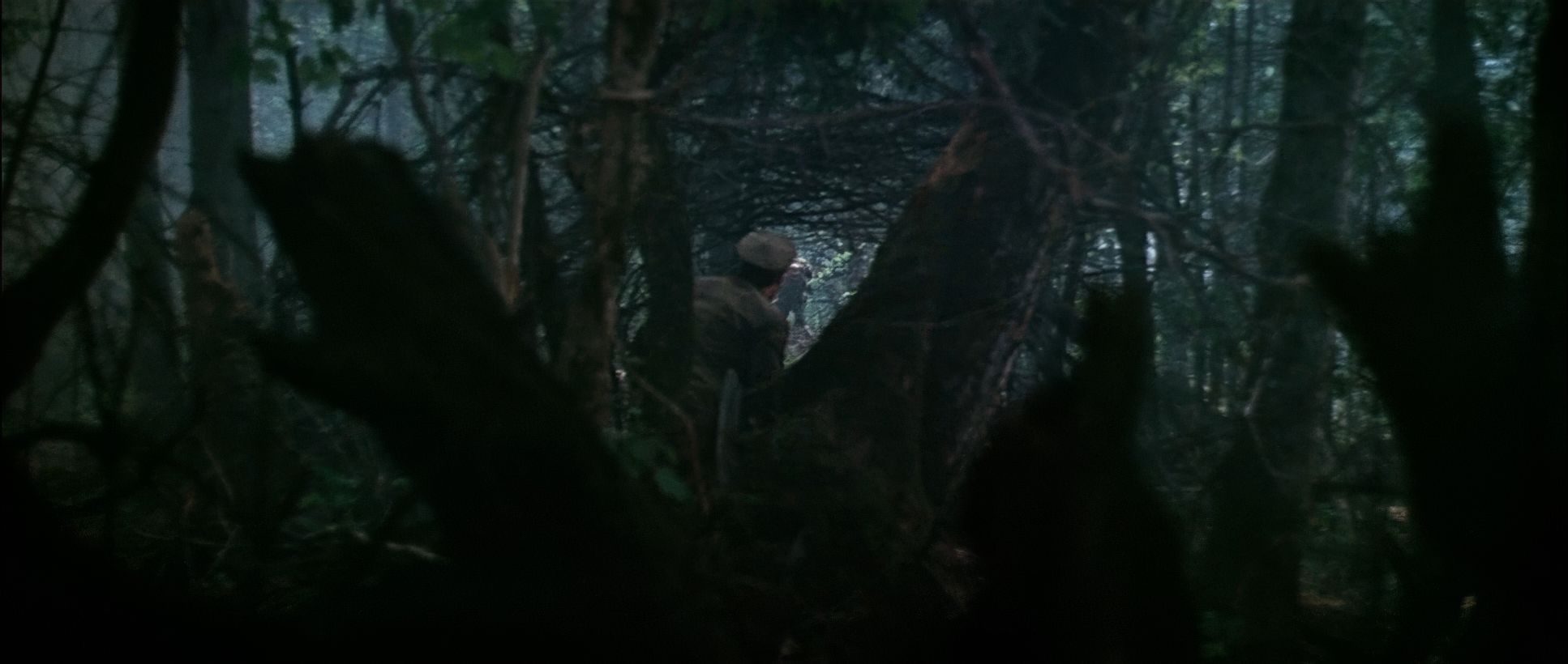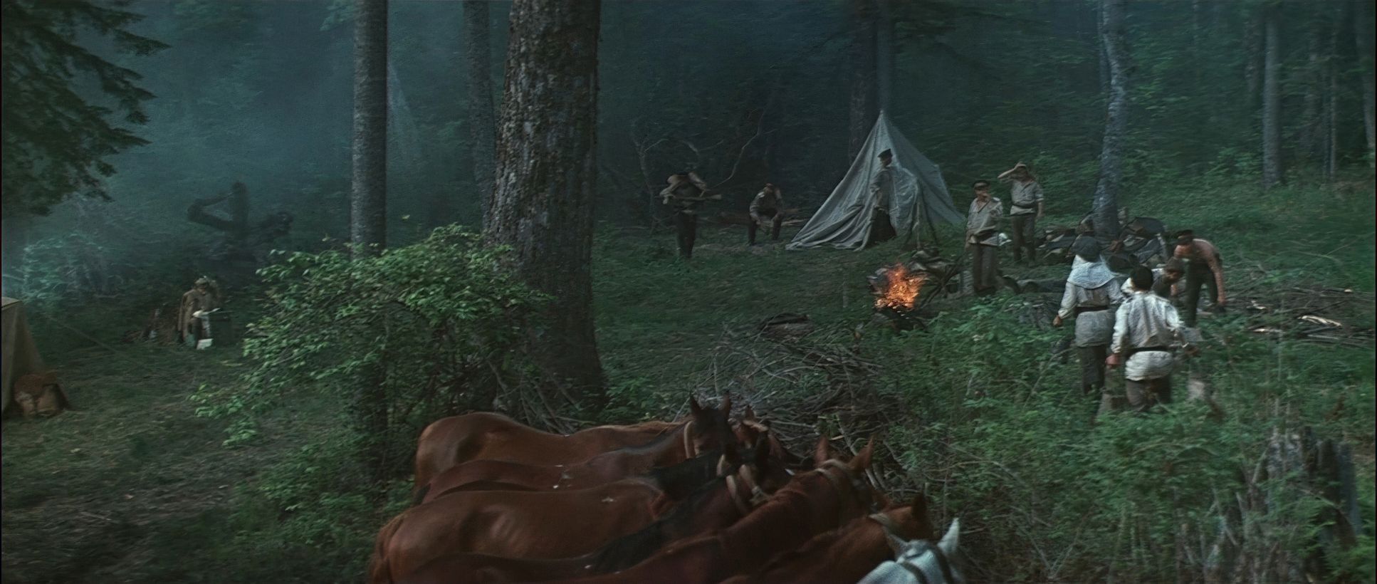 He often uses “frames-within-frames” branches, fog, or snowdrifts to make us feel embedded in the forest. As the bond between the two men grows, the blocking shifts. We move from those distant, isolated frames to more intimate medium shots during the campfire scenes. Some critics argue that certain shots feel “flat” or “lifeless” due to the static camera, but I disagree. As a colorist, I see those static frames as a choice to let the 70mm negative breathe, allowing the viewer to simply be in the environment without the distraction of unnecessary movement.