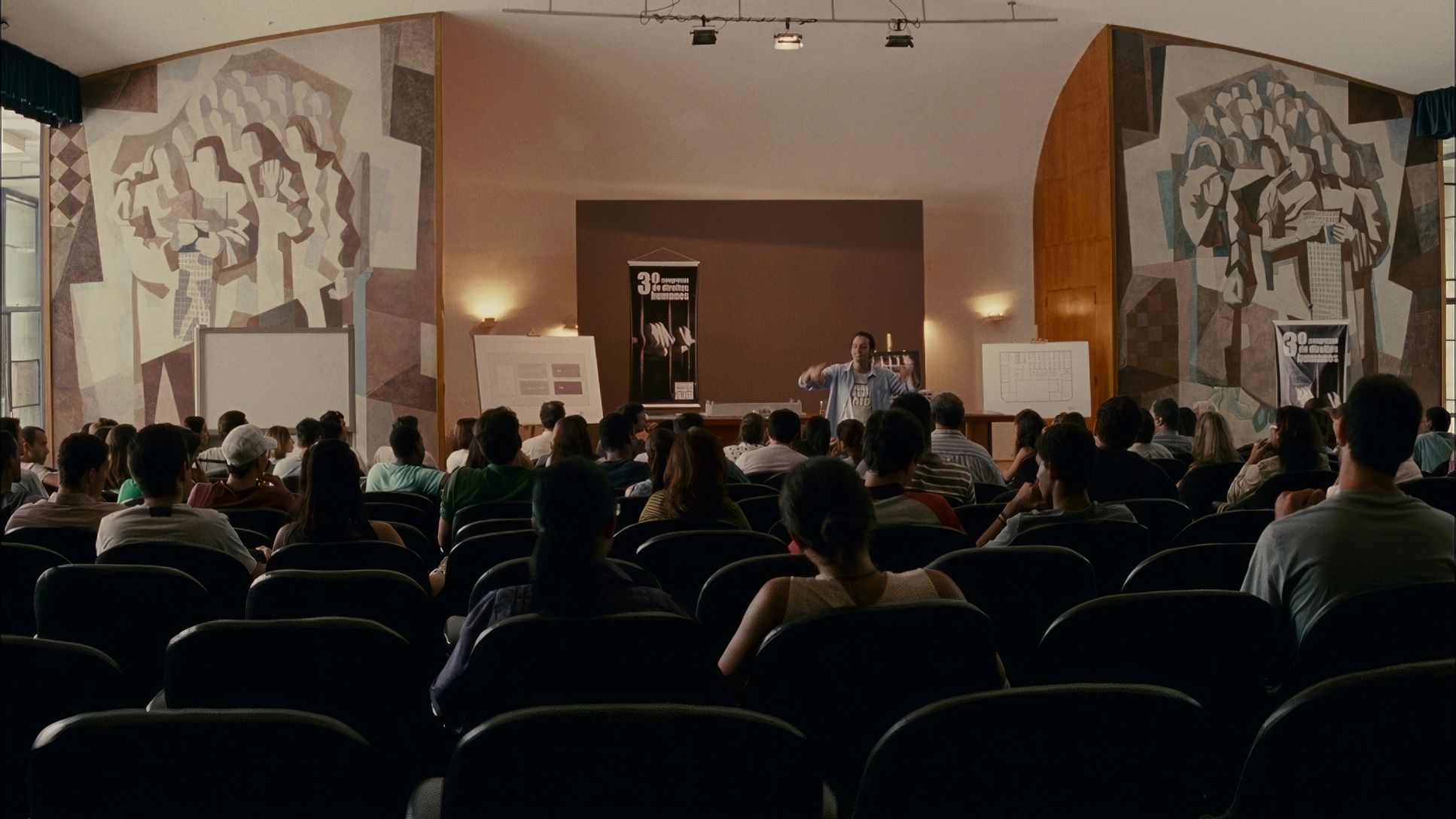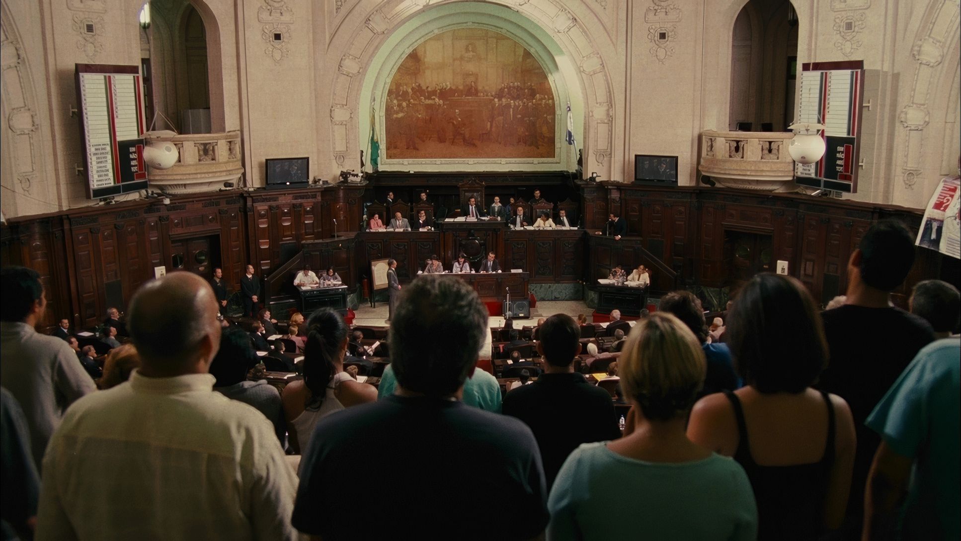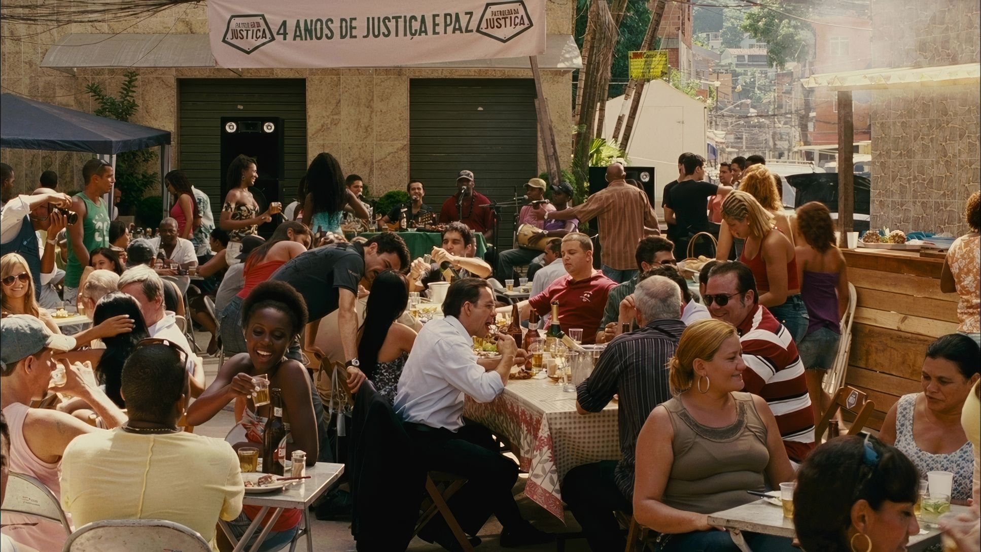 Despite the frenetic movement, Carvalho never loses sight of the narrative hierarchy. Elite Squad 2: The Enemy Within has a massive scope, juggling low-level cops, civilians, and high-ranking politicians. To manage this, the compositions often utilize deep focus, allowing the sprawling urban environment to weigh down on the characters.
