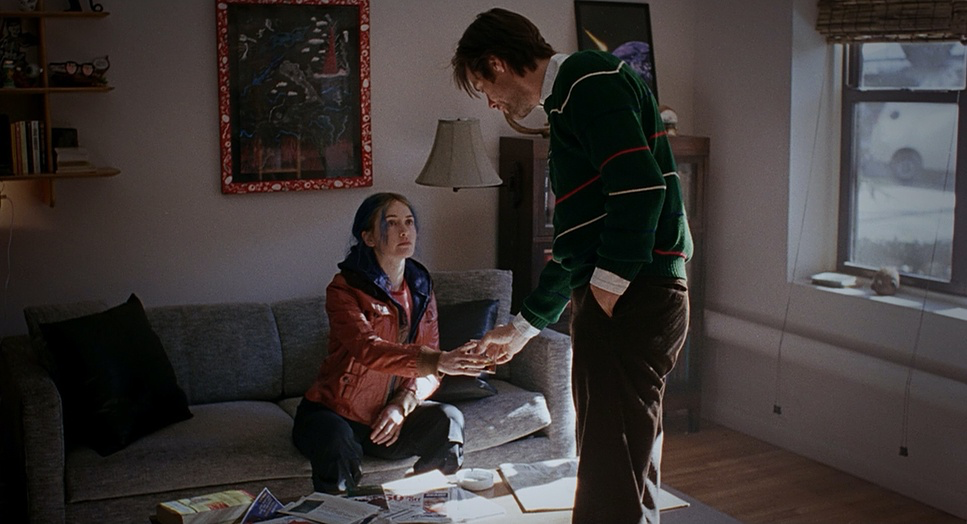 The lighting in Eternal Sunshine is famously anti-glamour. It embraces an “intentional roughness” that feels baked into the source material. Kuras leans heavily on available light and practical sources (lamps, overheads), keeping the exposure low-key. It makes the world feel tactile and lived-in, rather than a soundstage.
