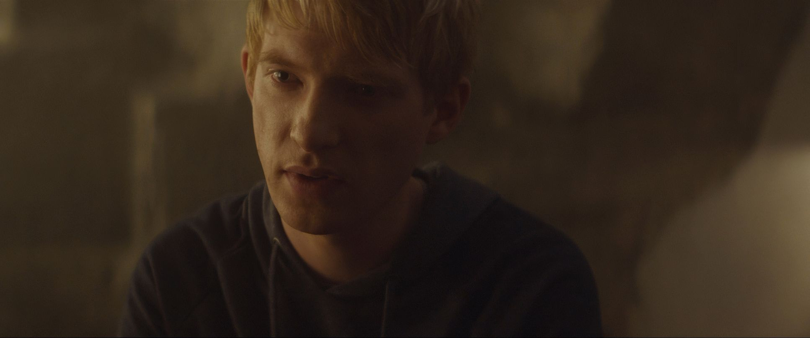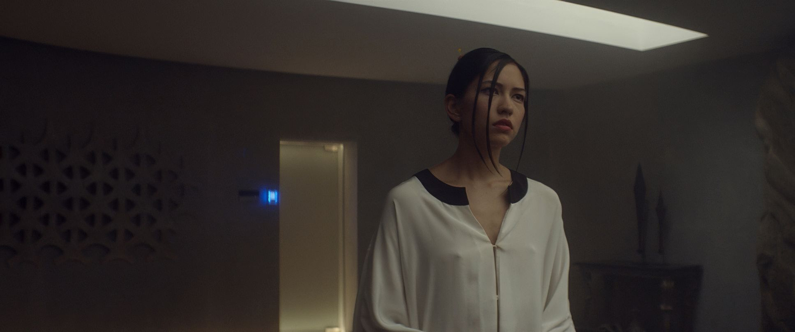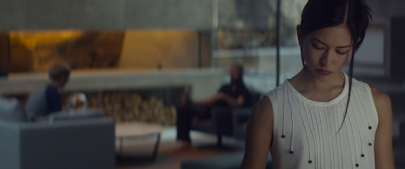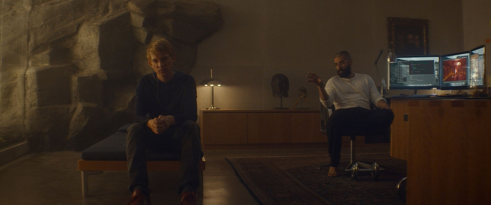 In a lesser grade, the cool tones would wash out the actors, making them look like part of the furniture. Here, the skin tones are protected with surgical precision. There’s a warmth in Caleb and Nathan’s faces that provides a necessary “organic” contrast to the cold, concrete environment. As a colorist, I’m looking at the shadow density the blacks are deep and rich, creating a sense of mystery, but they never “crush” the detail. The highlight roll-off on the reflective glass surfaces is incredibly smooth, likely a result of the F65’s dynamic range combined with a very tasteful film-print emulation in the ODT (Output Device Transform).