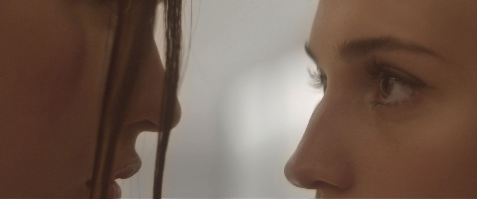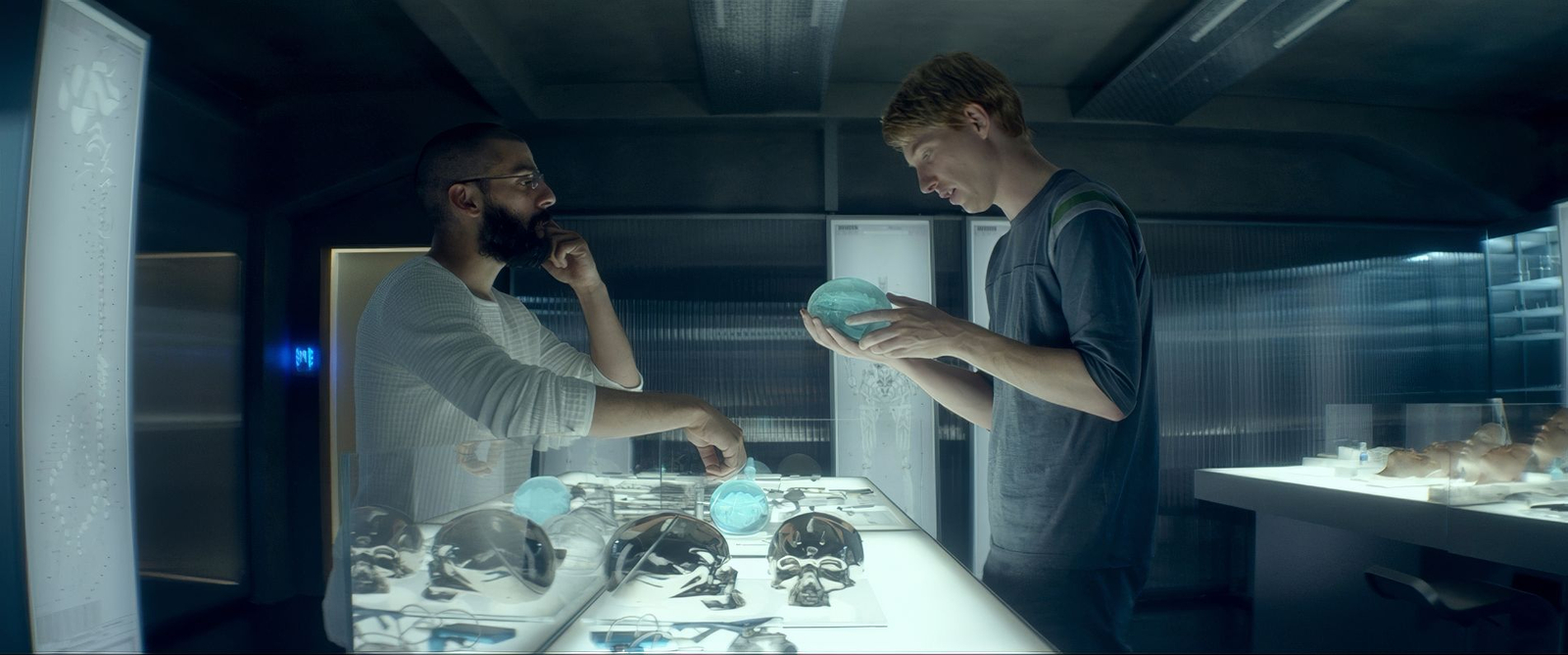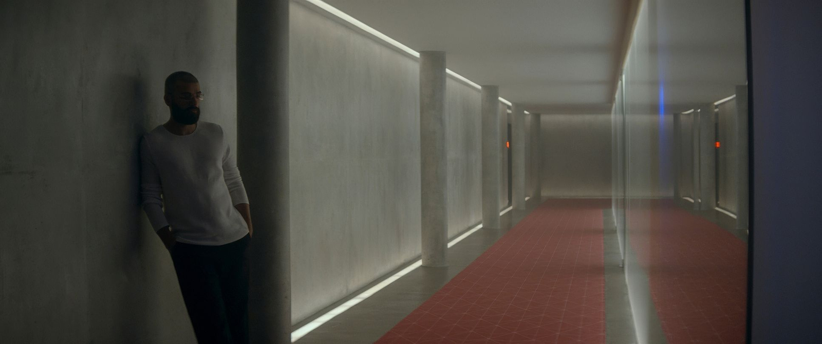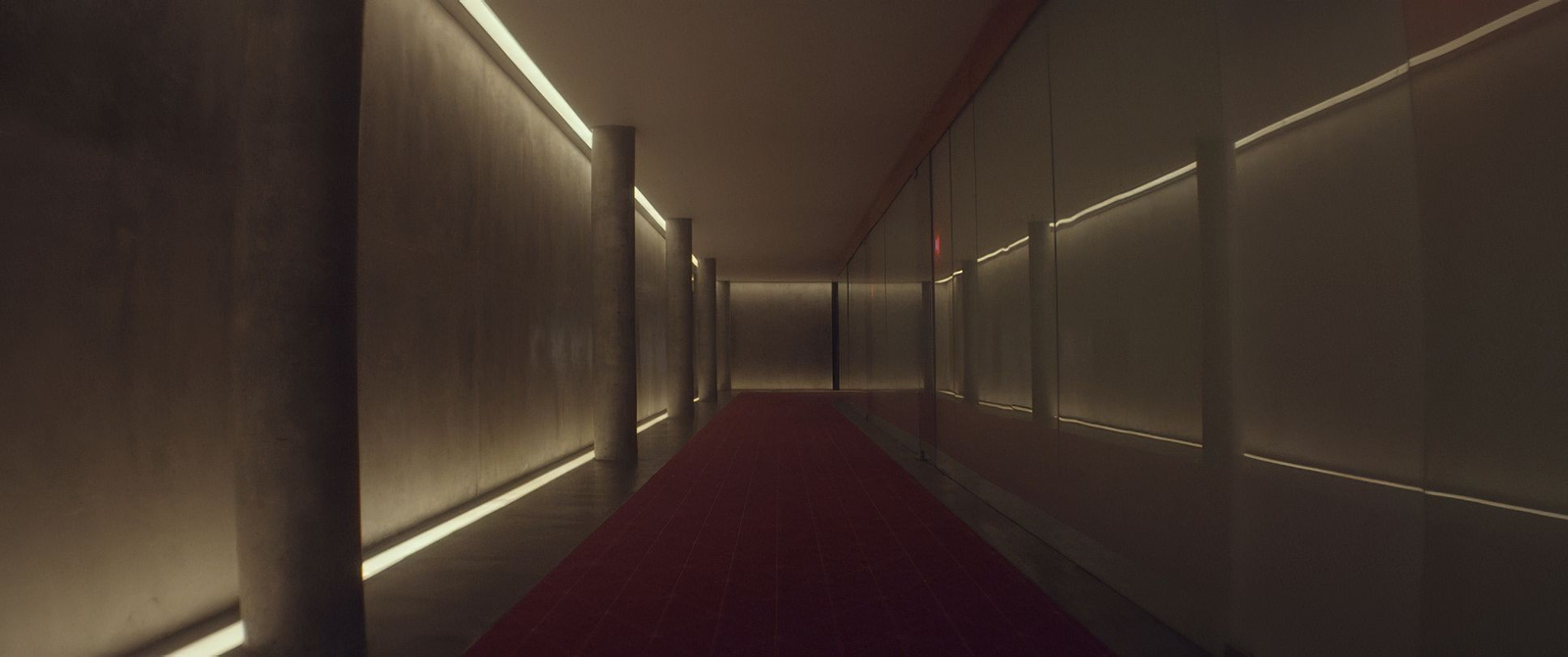 In a lesser grade, the cool tones would wash out the actors, making them look like part of the furniture. Here, the skin tones are protected with surgical precision. There’s a warmth in Caleb and Nathan’s faces that provides a necessary “organic” contrast to the cold, concrete environment. As a colorist, I’m looking at the shadow density the blacks are deep and rich, creating a sense of mystery, but they never “crush” the detail. The highlight roll-off on the reflective glass surfaces is incredibly smooth, likely a result of the F65’s dynamic range combined with a very tasteful film-print emulation in the ODT (Output Device Transform).