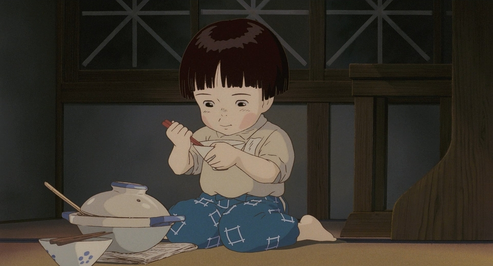 From my perspective as a colorist, Grave of the Fireflies is a masterclass in tonal sculpting. The overall palette is remarkably desaturated, leaning heavily into muted earth tones, drab grays, and dusty browns. This visual scarcity manifests the physical scarcity of wartime Japan. Bright, vibrant colors are starved out of the frame, making their rare appearance impactful. The fiery oranges and reds of the air raids are horrifying precisely because they burst forth from an otherwise muted world.