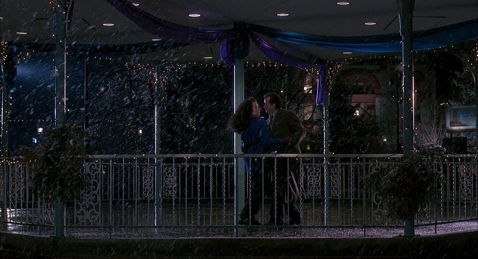 As he evolves, he physically turns toward people. He starts entering the group. His proximity to Rita changes drastically. At first, he’s trying to corner her (literally blocking her path), which feels predatory. By the end, during the snow sculpture scene or the dance, the blocking is cooperative. They move together. The lensing provides a neutral window, but the blocking shows us the change in Phil’s soul.