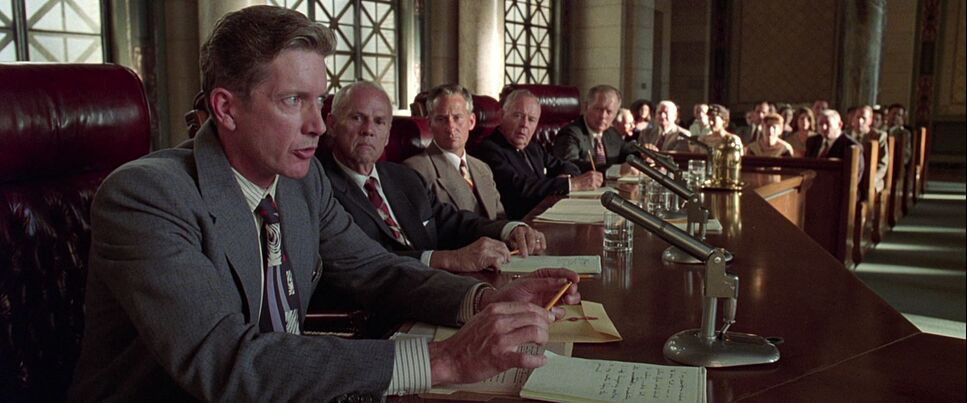 He sits alone, facing a two-way mirror. We don’t just see him; we see the reflections of the white officers superimposed over him. The reflection is “big and dominant,” while the suspect appears physically diminished. It’s a brilliant use of depth cues to visualize systemic injustice. The layering of reflections creates a visceral sense of oppression without needing to over-light or over-act the scene. Throughout the film, framing characters against architectural elements doorways and windows reinforces this sense of entrapment.