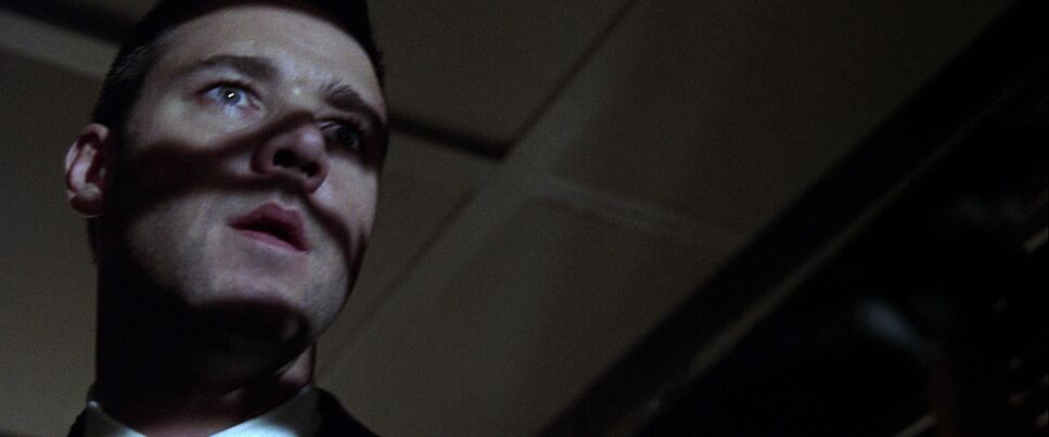 The introductions of Exley, White, and Vincennes use tight framing to establish their individual codes of honor before they collide in the larger narrative. But the most striking composition one that always sticks with me occurs during the interrogation of the young African American suspect in the Night Owl case.