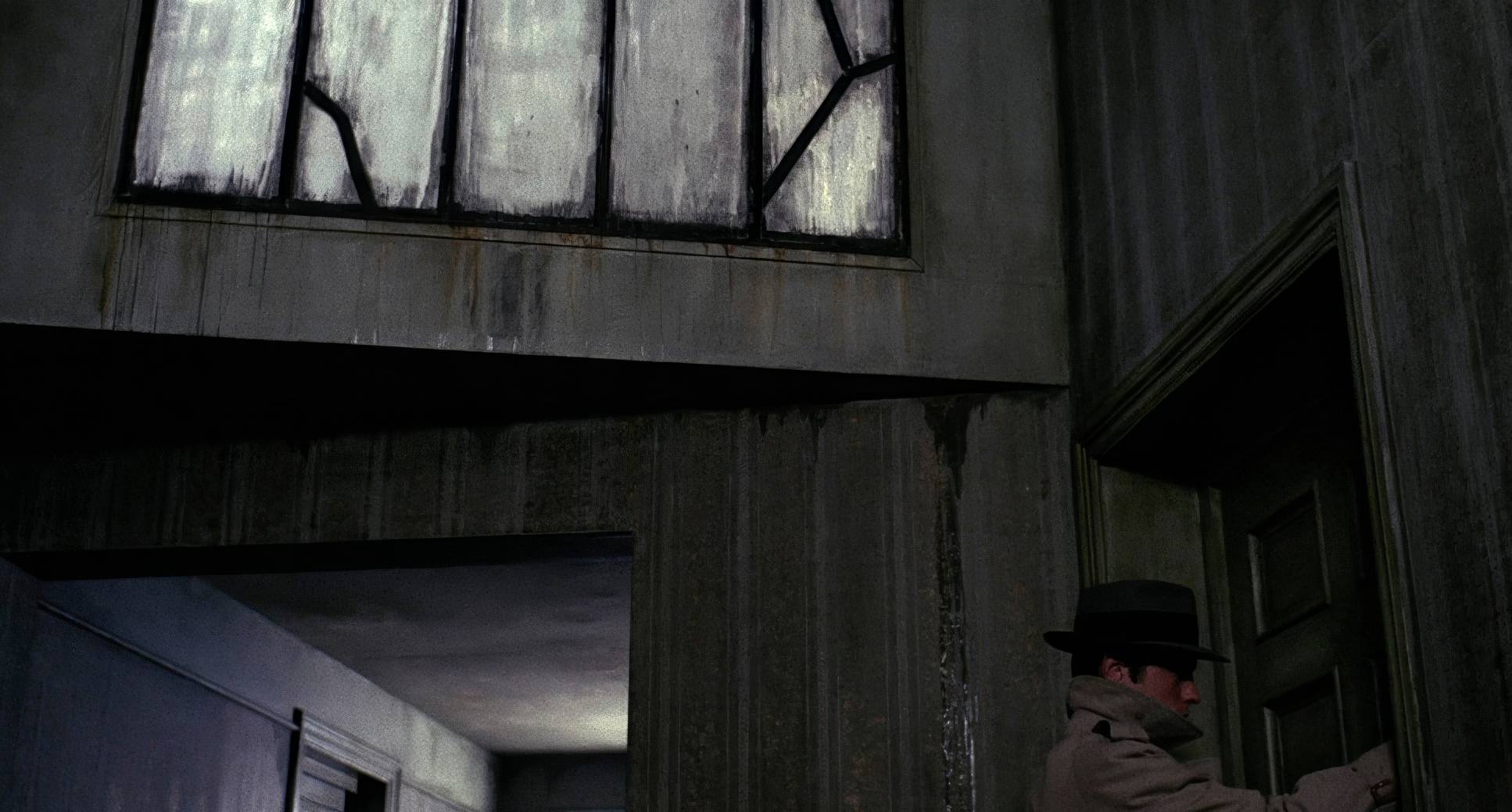 Decaë’s compositions are all about entrapment. Jeff is constantly framed within “frames” doorways, windows, and those long, oppressive corridors. Even in the opening shot, he’s tucked away in the corner of a room with massive ceilings. It makes him look small, almost insignificant against the weight of the world.