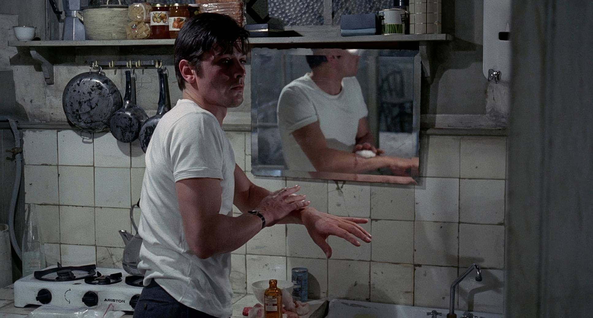 The blocking is where Alain Delon shines. His performance is purely physical. He moves with a ritualistic grace, and the camera is always positioned to catch the micro-details of his trade checking a pulse, breaking into a car, adjusting his hat. It’s a slow, deliberate choreography. The camera doesn’t just record the action; it observes a ritual.