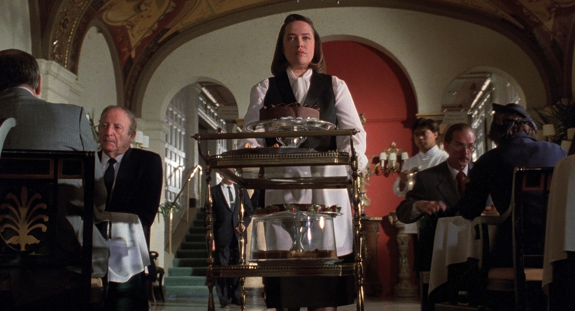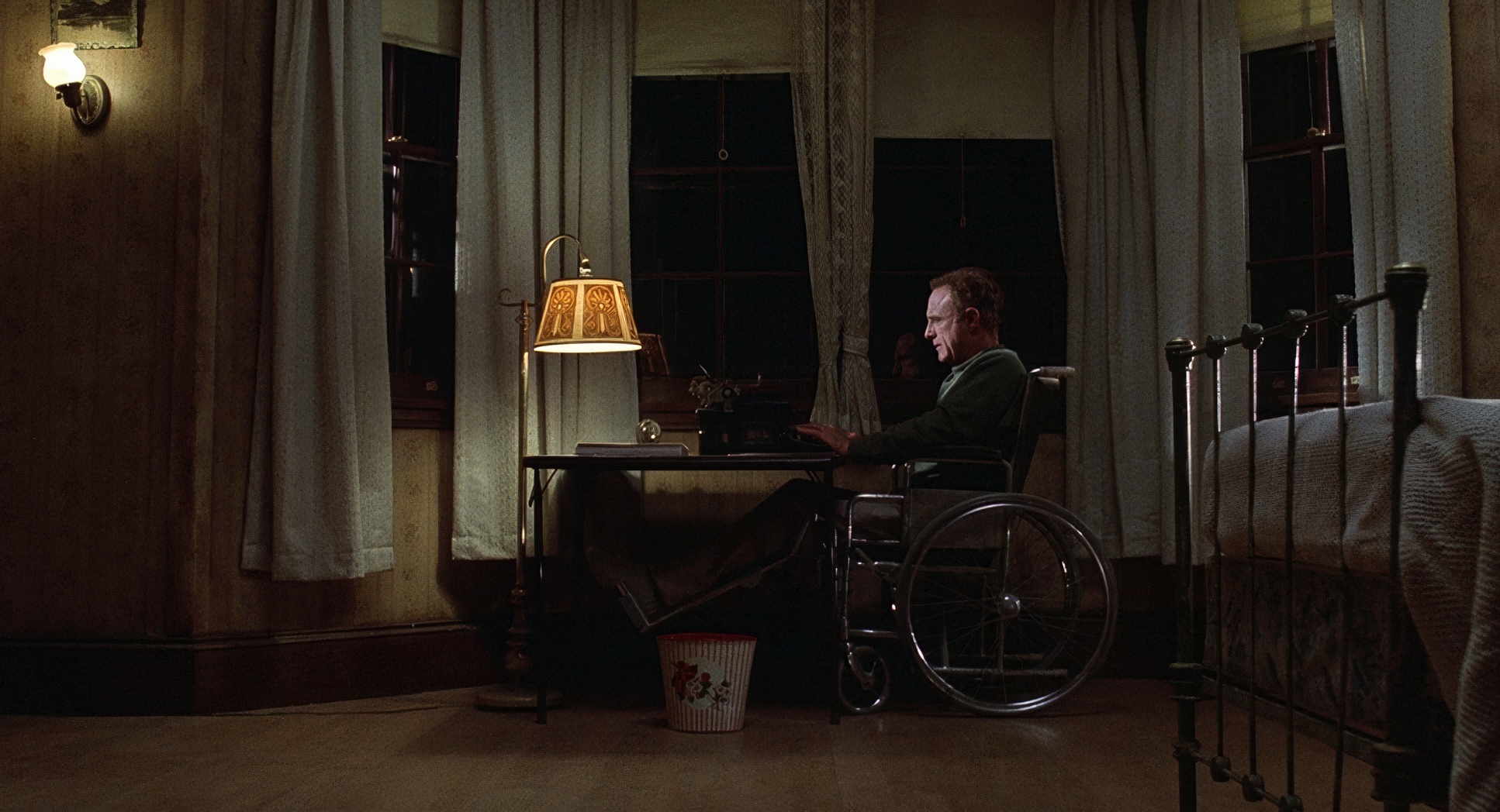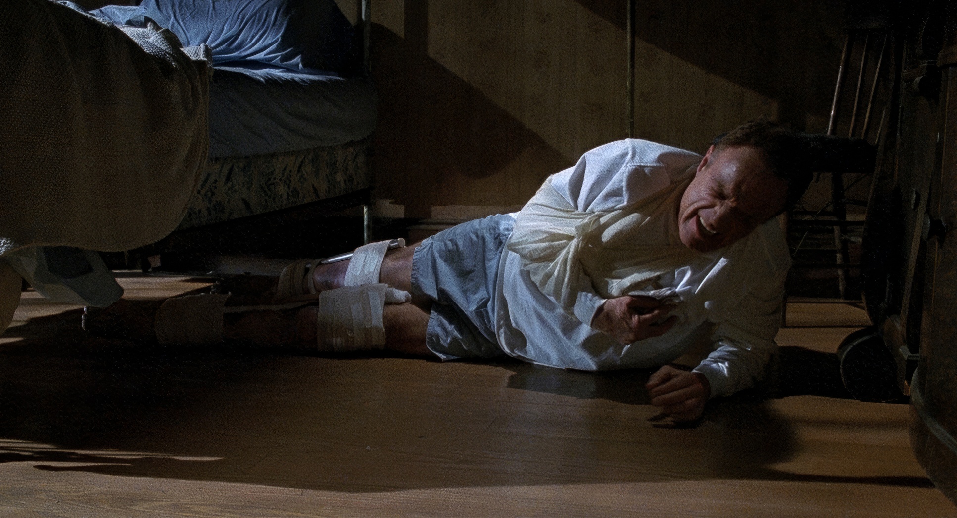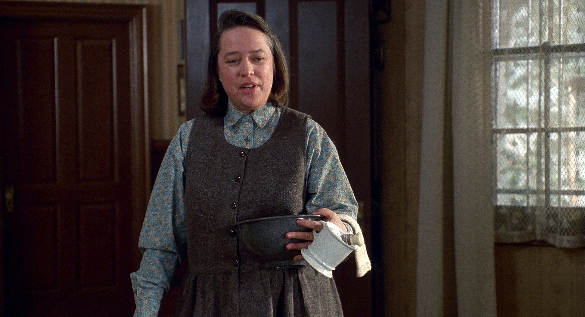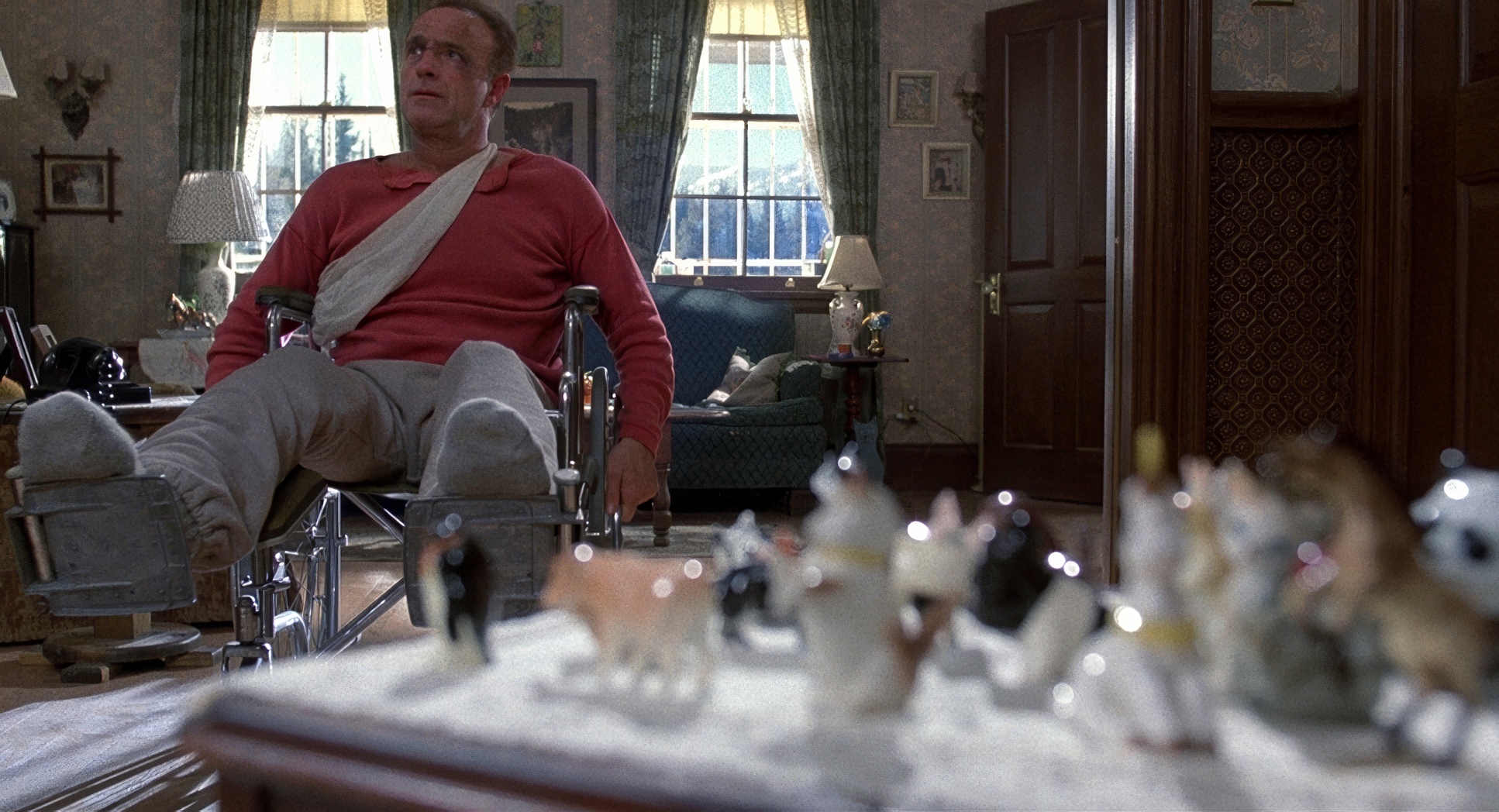 Sonnenfeld loves to use framing to bully the audience. Paul is constantly “boxed in” framed by bedposts, doorways, or the back of a wheelchair. He’s always being dwarfed by furniture or by Annie herself. It’s claustrophobia 101.