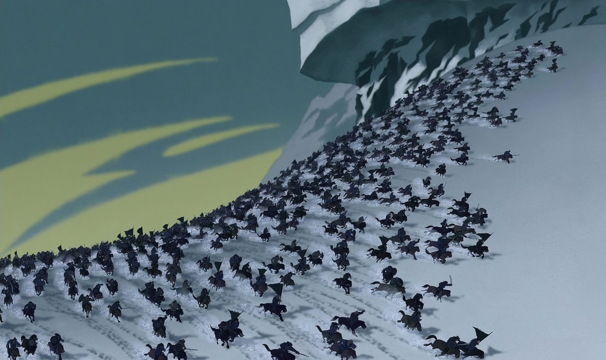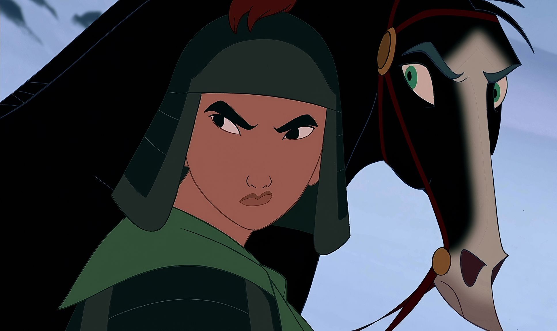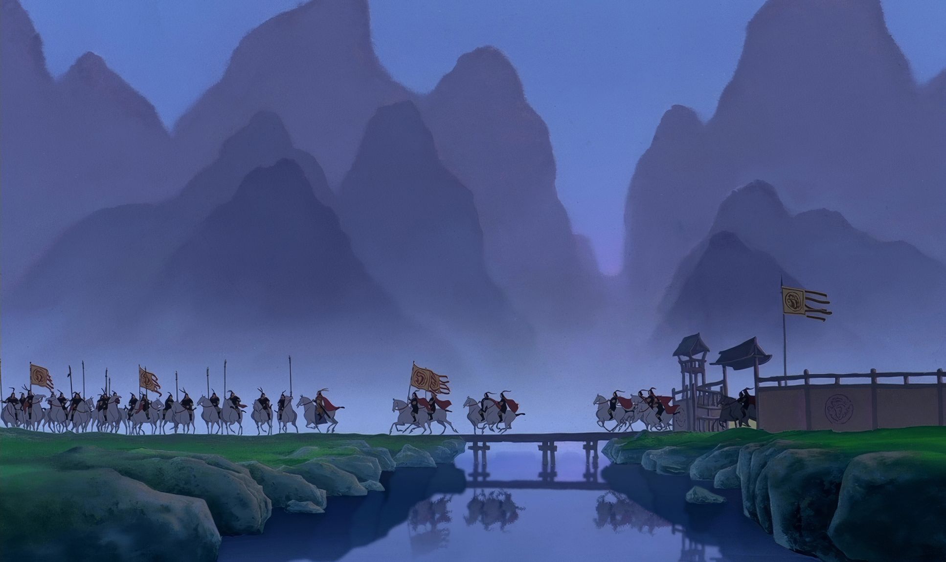 The animators clearly had a deep handle on classic compositional principles. Leading lines (like those sweeping mountain paths) and the strategic use of negative space guide the eye perfectly. I also love the character designs; they are “abstracted” enough to feel like art, yet “grounded” enough to feel human. A great example of dynamic blocking is the training montage. Having the men singing on the outside of the horses while Mulan is physically separated from the camp is a brilliant way to visually illustrate her outsider status even as she tries to integrate.