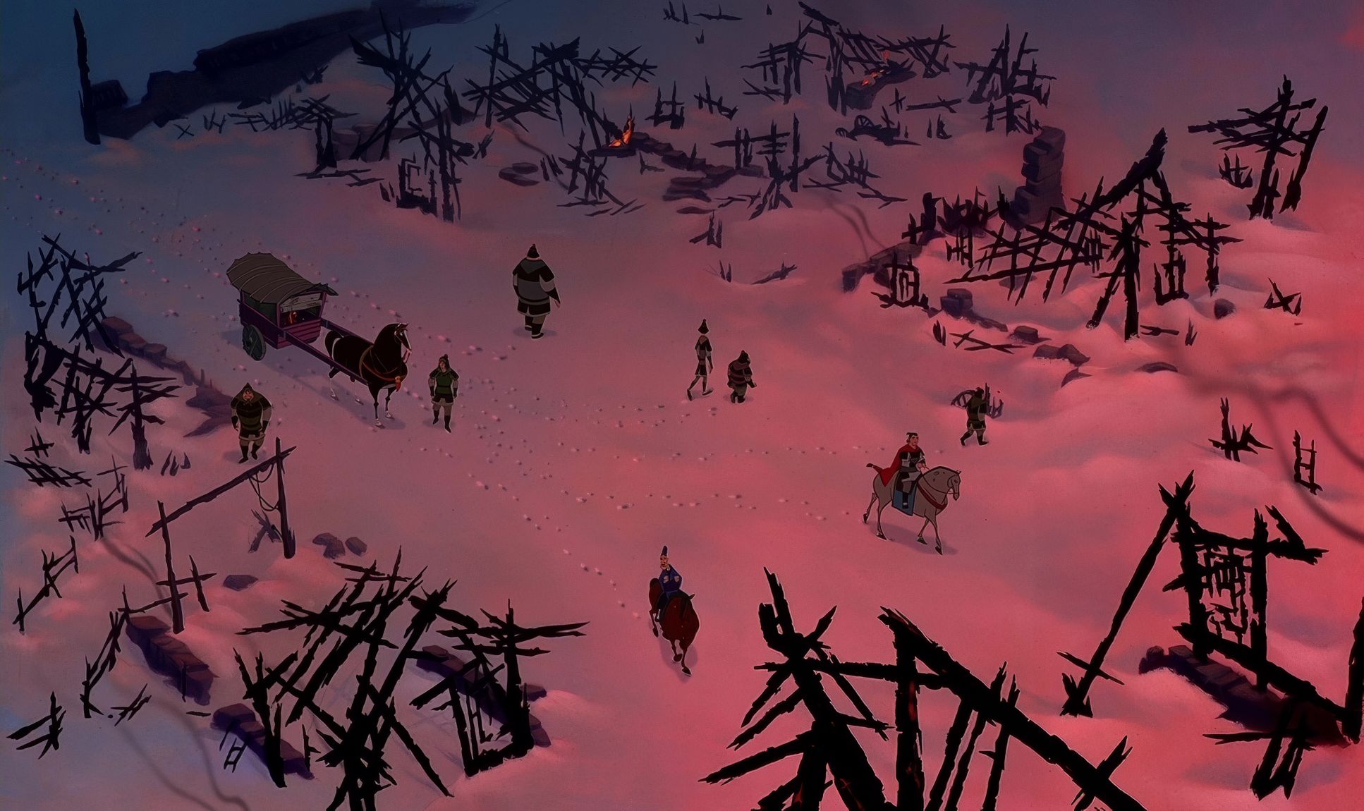 Then there’s the symbolic lighting. The transition to the desolate, shadow-drenched village is striking, but the sky during the Shan Yu encounter is the winner. The clouds are a bright, bloody pink before Mulan spares him, then it shifts to dusk once the threat is gone. It’s as if the sky itself is reflecting the narrative’s emotional logic.
