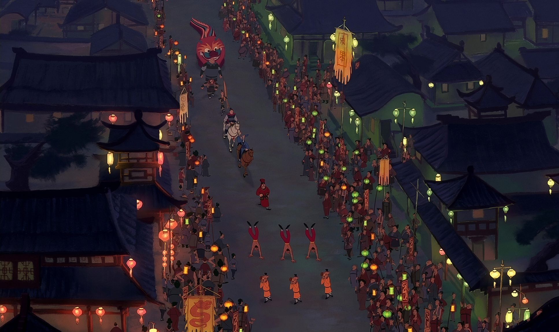 The lighting in Mulan operates on the same principles as live-action cinematography. We see motivated lighting everywhere strong directional light from a virtual sun or the warm, flickering glow of torchlight in the indoor scenes.