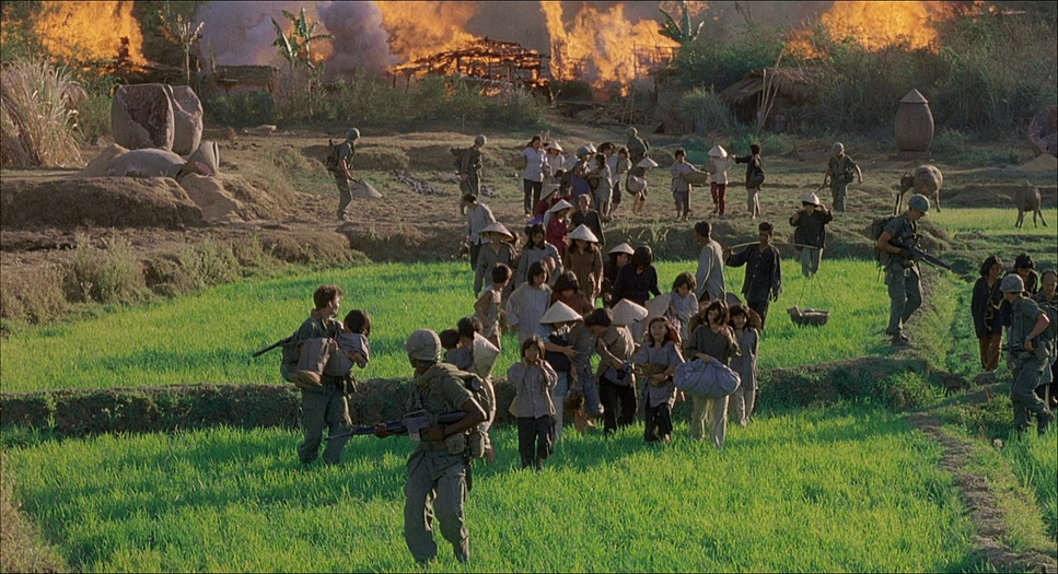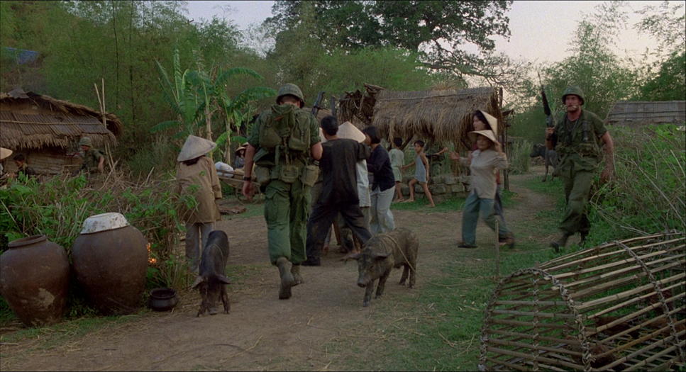 The composition often emphasizes the lack of individuality. On patrol, the soldiers are strung out in deep focus, just ants in a green hell. But what I love most are the close-ups. They are uncomfortably tight. When we are in the bunkers, the camera is right in their faces, distorting features slightly with wide angles. It forces an intimacy that feels almost violated. During the village raid, the juxtaposition of wide shots of destruction against tight, sweaty close-ups of the soldiers’ faces anchors the horror in human reaction rather than just pyrotechnics.