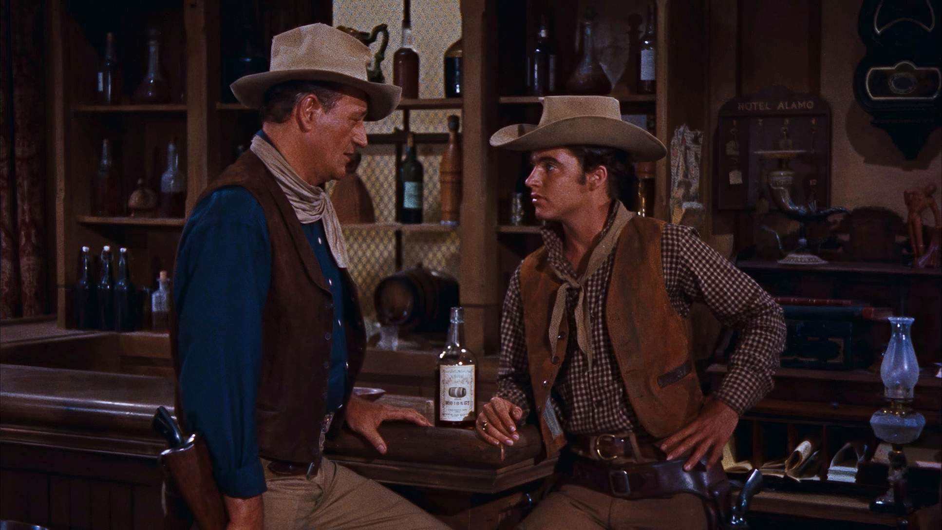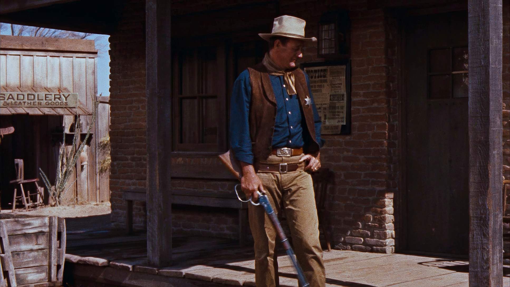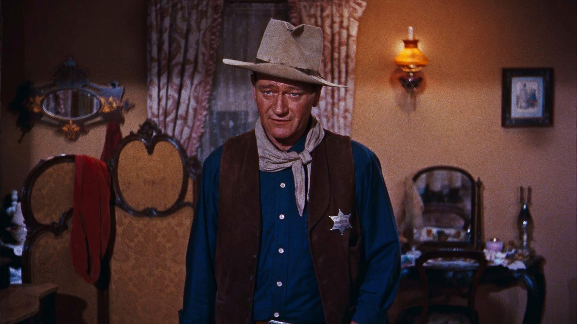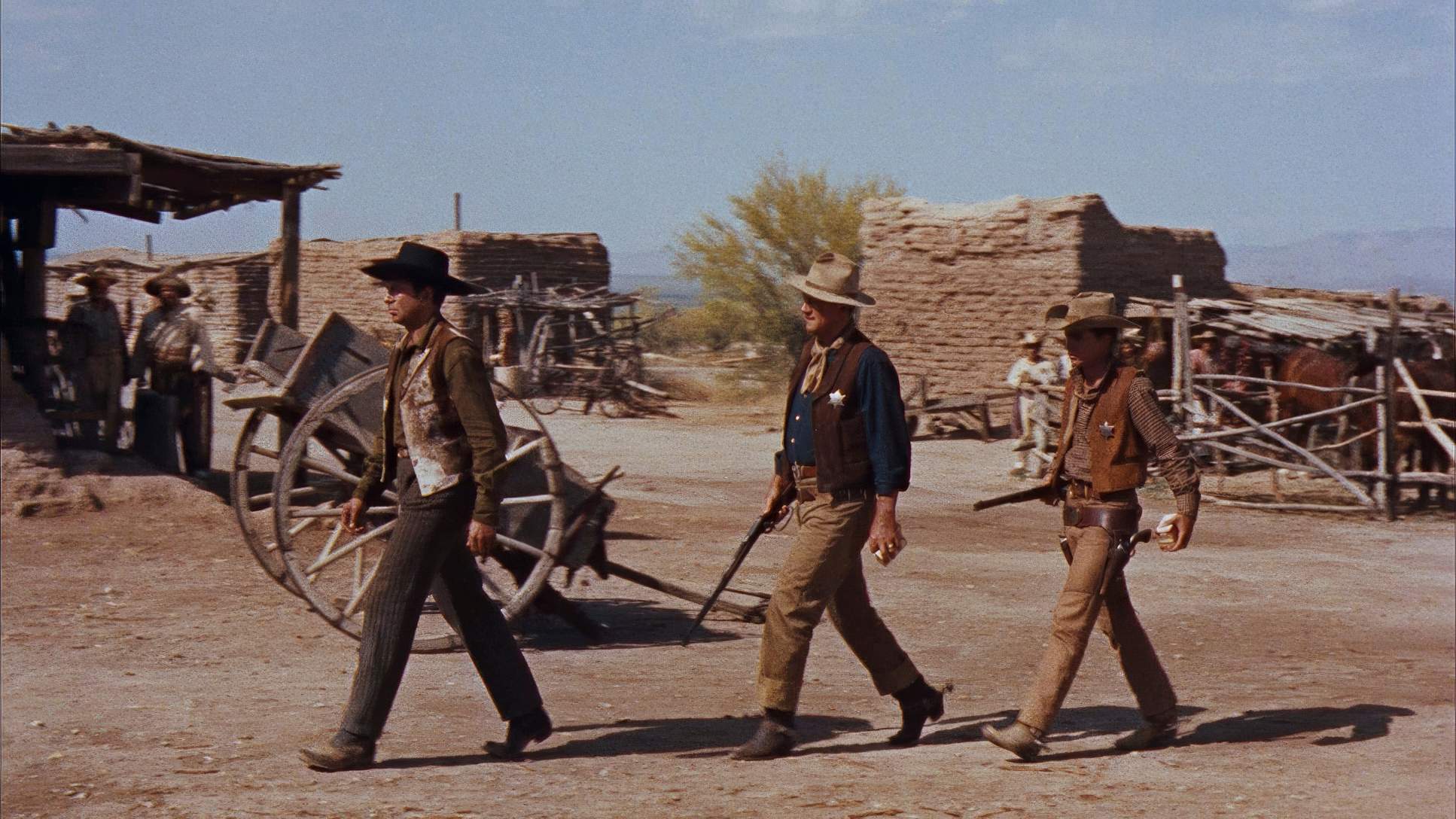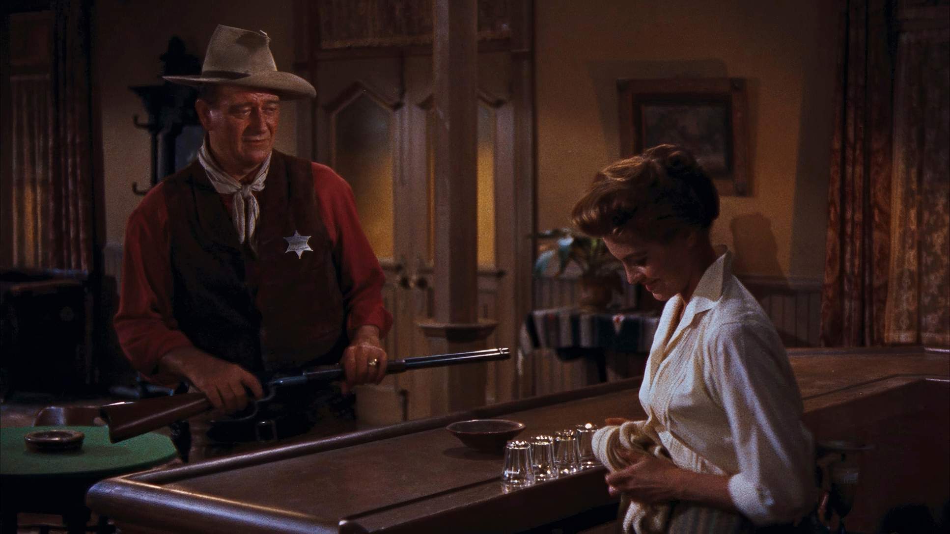 From my perspective at the grading panel, Rio Bravo is a masterclass in hue separation. The original 35mm stock had that beautiful Technicolor/Eastmancolor warmth, and the recent 4K restoration (HDR10) really highlights this. When you see the red of Wayne’s shirt against the ochres of the desert or the specific “pop” of Feathers’ yellow top, you’re seeing intentional color design.