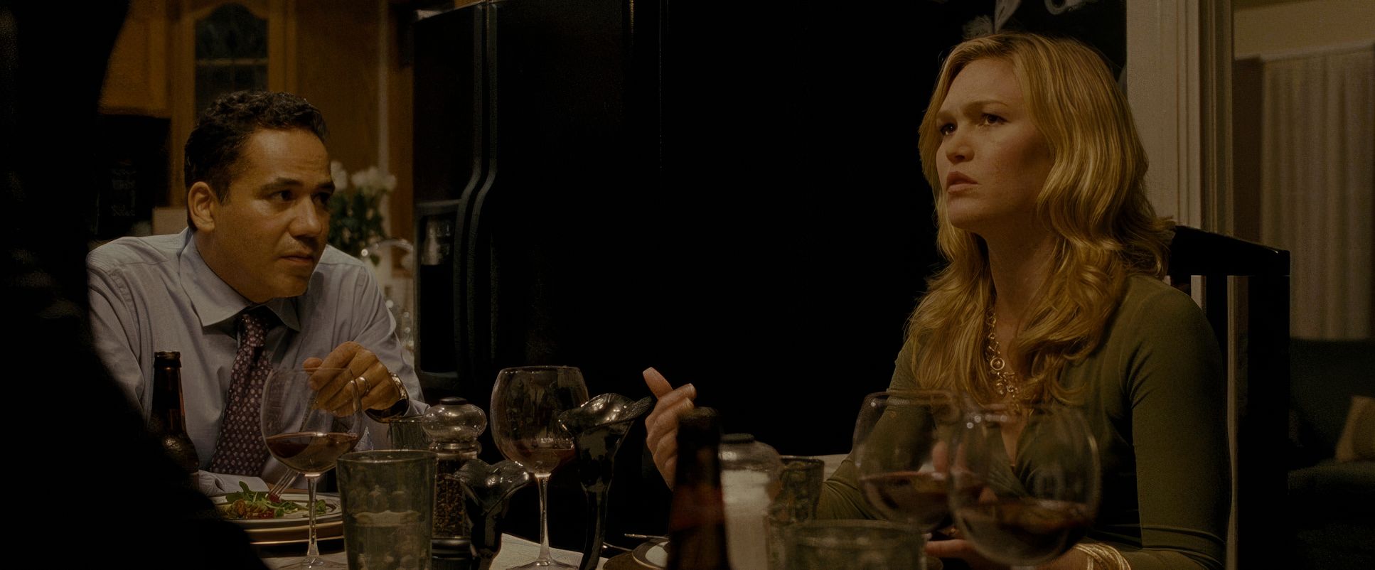 The contrast isn’t punchy or “commercial.” There’s a rich mid-tone density that gives the image a photographic truth. I especially love the highlight roll-off on the film stock; look at the bright windows or the lamps in the background they don’t clip harshly like digital. They bleed into the frame with a soft, organic texture. The skin tones are kept incredibly authentic, which is vital for a film that relies entirely on human performance. It’s a masterclass in “invisible” grading the kind that makes the movie look beautiful without the audience ever realizing a colorist was involved.