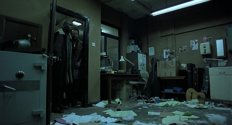 The lighting in Snatch is fundamental to its gritty production design. While the fact sheets might technically classify scenes like the bank interior as “soft light,” the film’s overall impression is defined by a raw, high-contrast approach. Motivated lighting is key here; practicals like bare bulbs, streetlights, and neon signs are integrated into the frame and then pushed for dramatic effect.