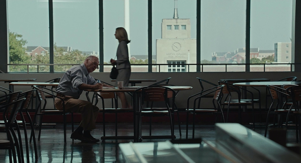 The compositional choices in Spotlight are equally thoughtful and grounded in realism. The film employs a 1.85:1 aspect ratio a spherical format that feels taller and more akin to a photograph or a printed page than the wider, more cinematic 2.39:1 anamorphic ratio. In the newsroom scenes, they frequently use wider focal lengths with a deeper depth of field. This allows multiple characters and elements to remain in focus within the frame, emphasizing the collaborative nature of the team and the sheer volume of paperwork surrounding them.