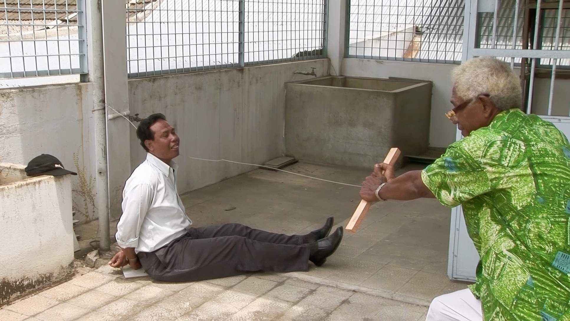 The camera work is a study in controlled chaos. In the documentary portions, it’s mostly handheld and responsive. When Anwar is just walking around or Safit Padeid is extorting money from local vendors, the camera follows with a vérité intimacy. It’s a bit wobbly, a bit raw, which makes their casual assertion of power feel even more unsettling.