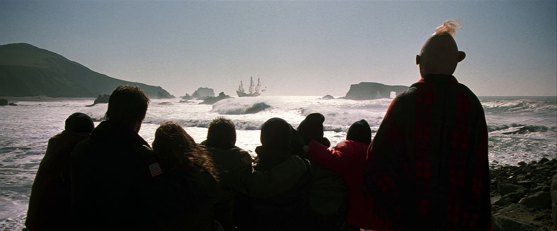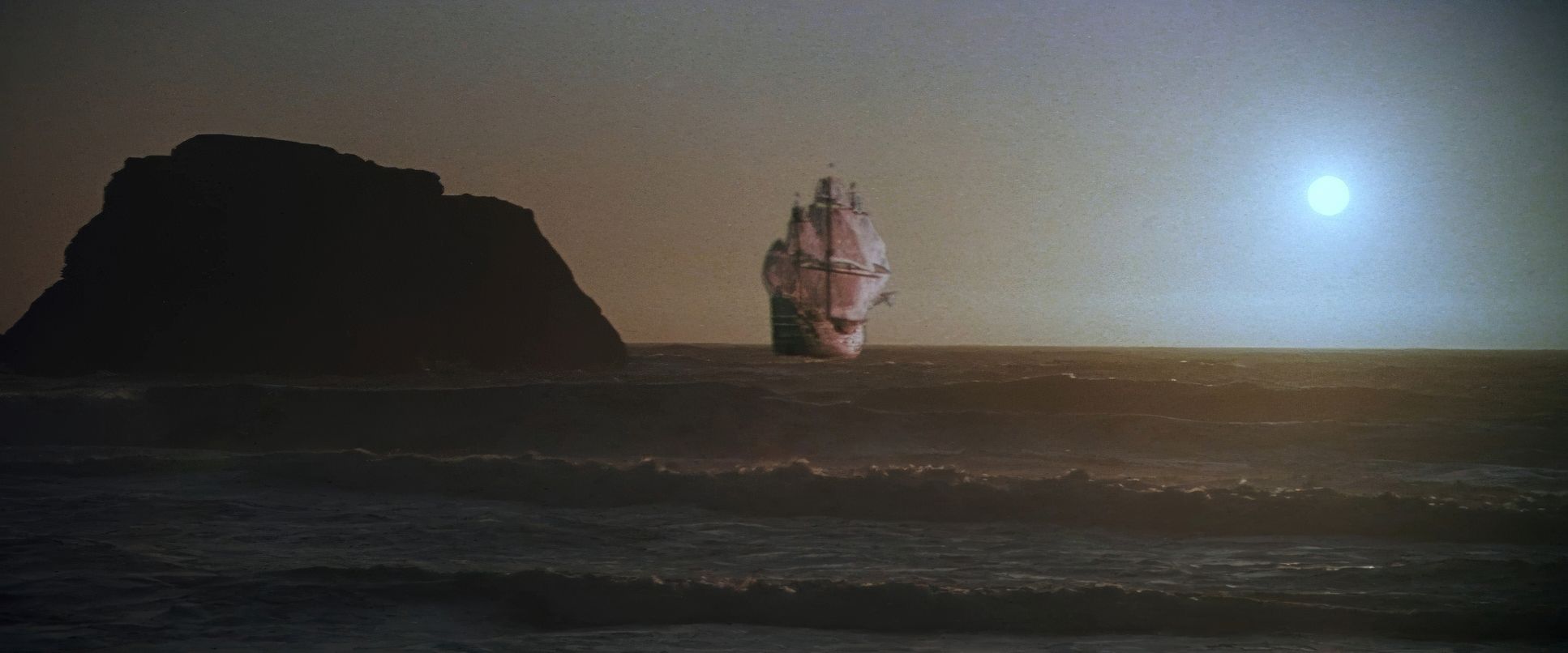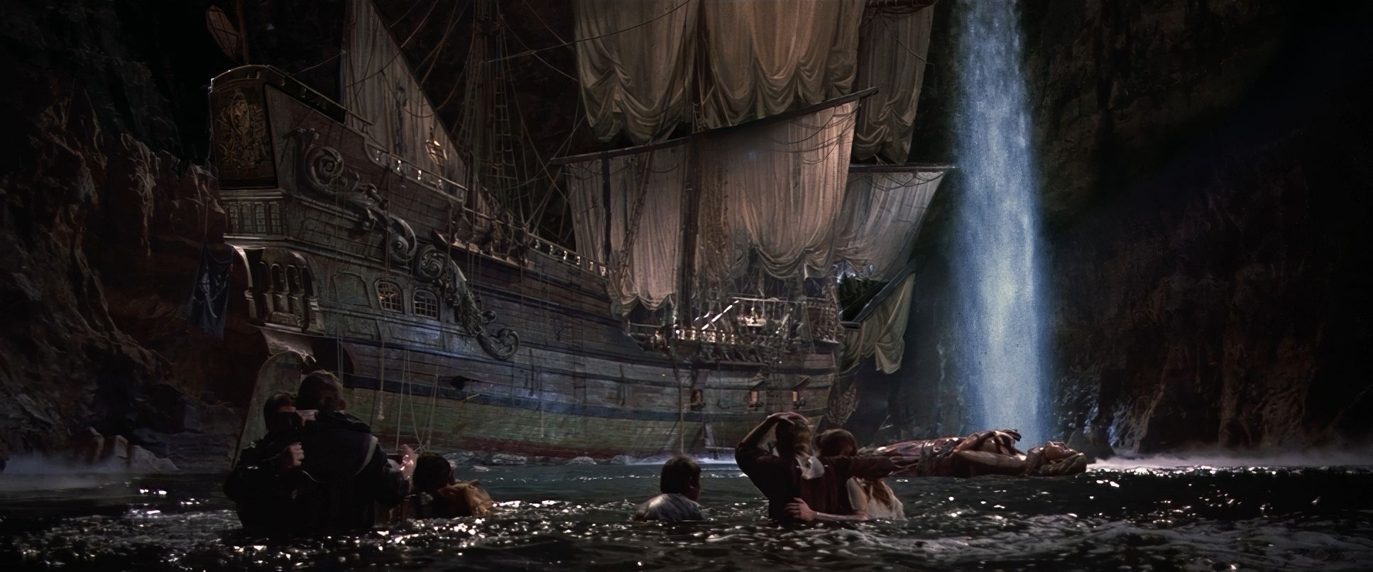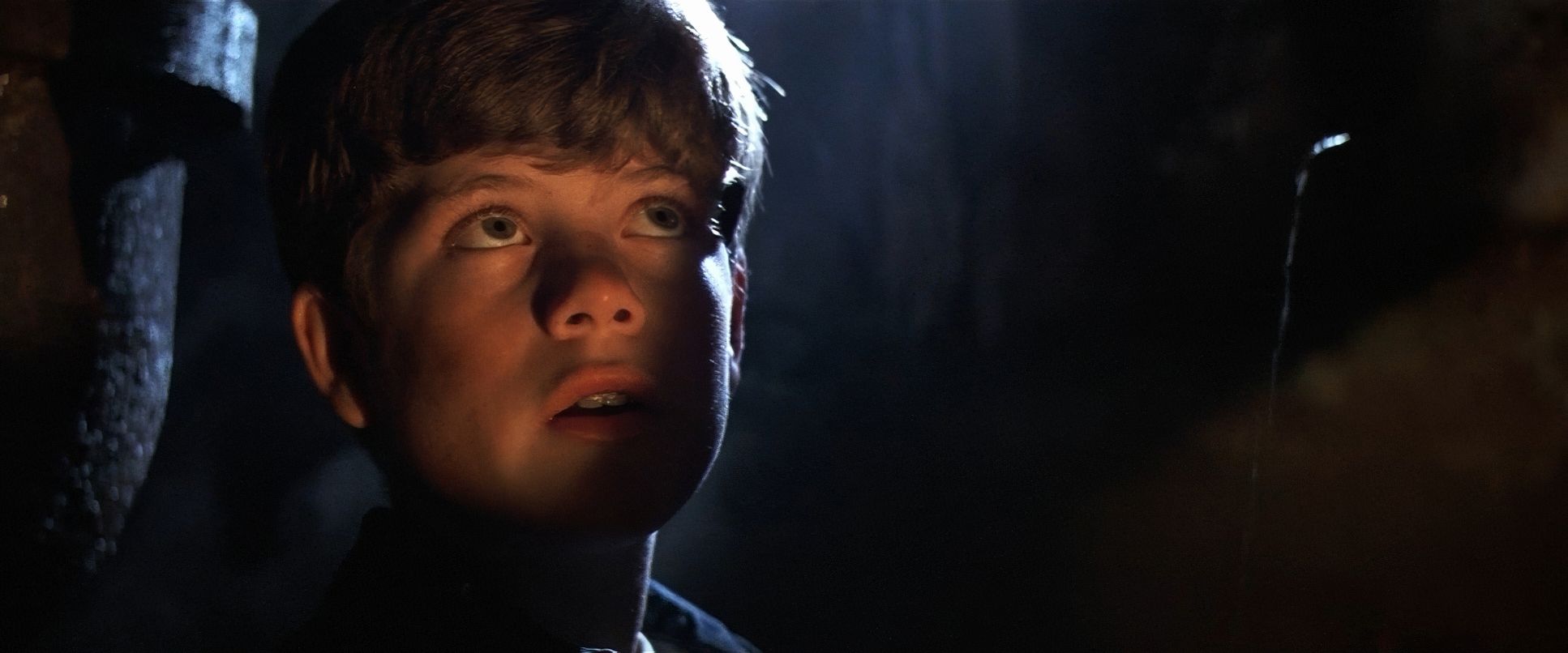 As they descend into the caverns, the compositions become more dynamic. We see a lot of deep-focus work where one kid is in the foreground determined or terrified while the others are visible behind him, maintaining that group solidarity even in tight spaces. Conversely, the Fratellis are often framed to look imposing or dysfunctional, using low angles to enhance their menace. And then there’s that final, iconic wide shot of the ship. Even if the optical effect is a bit “ropey” by modern standards the black levels don’t quite match the sky and the matte lines are visible the compositional intent is perfect. It’s the aspirational “wide” that signals the end of an era.