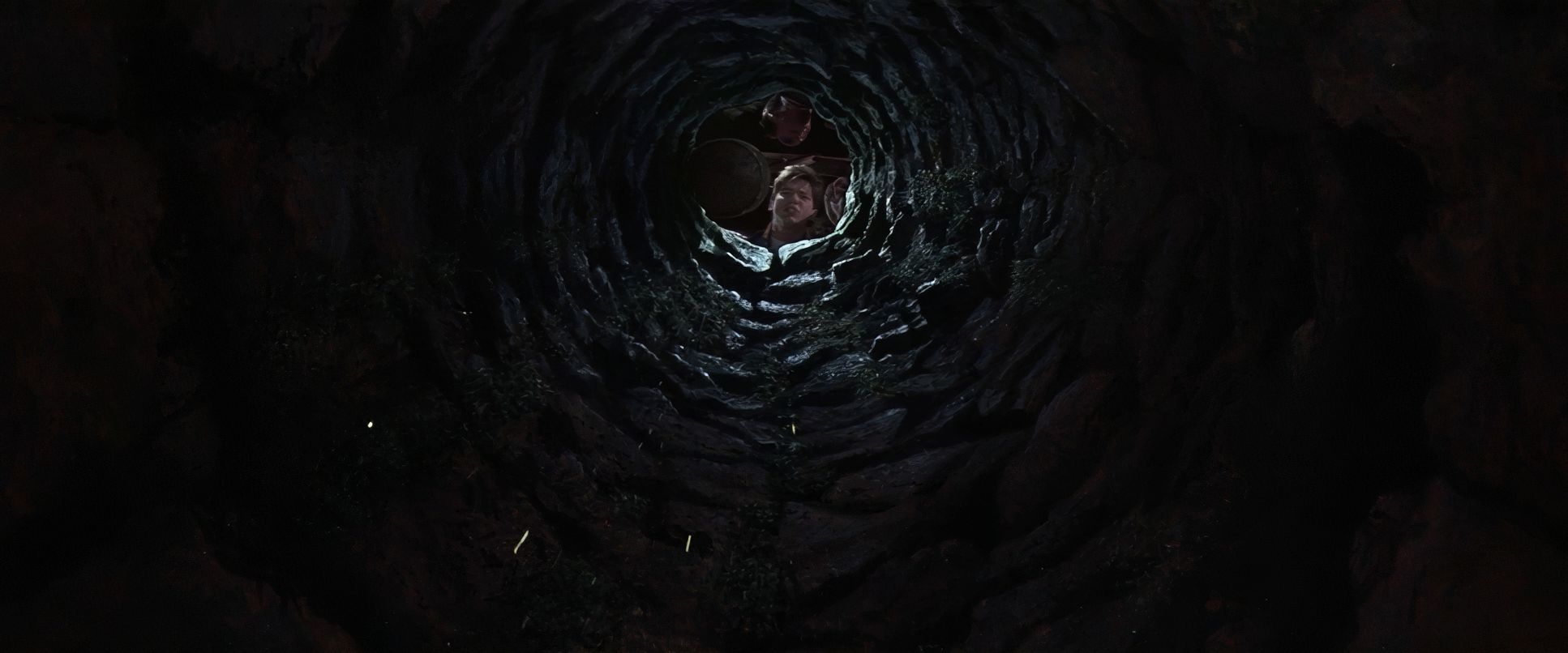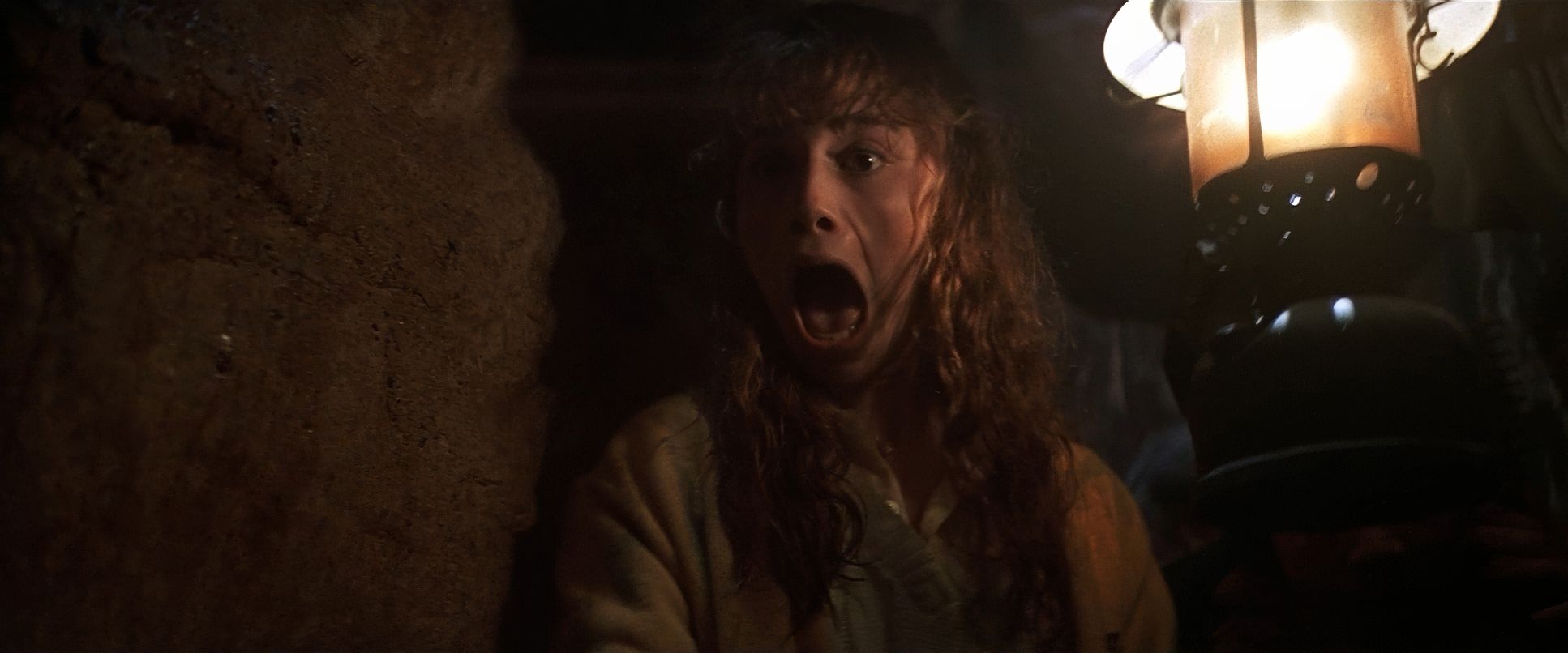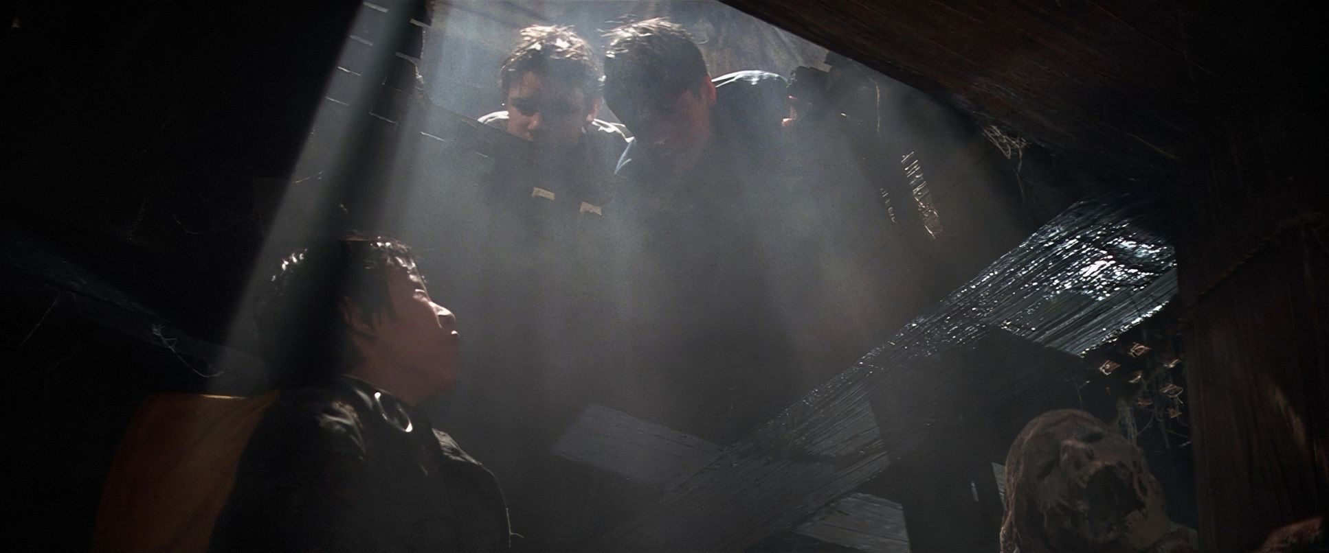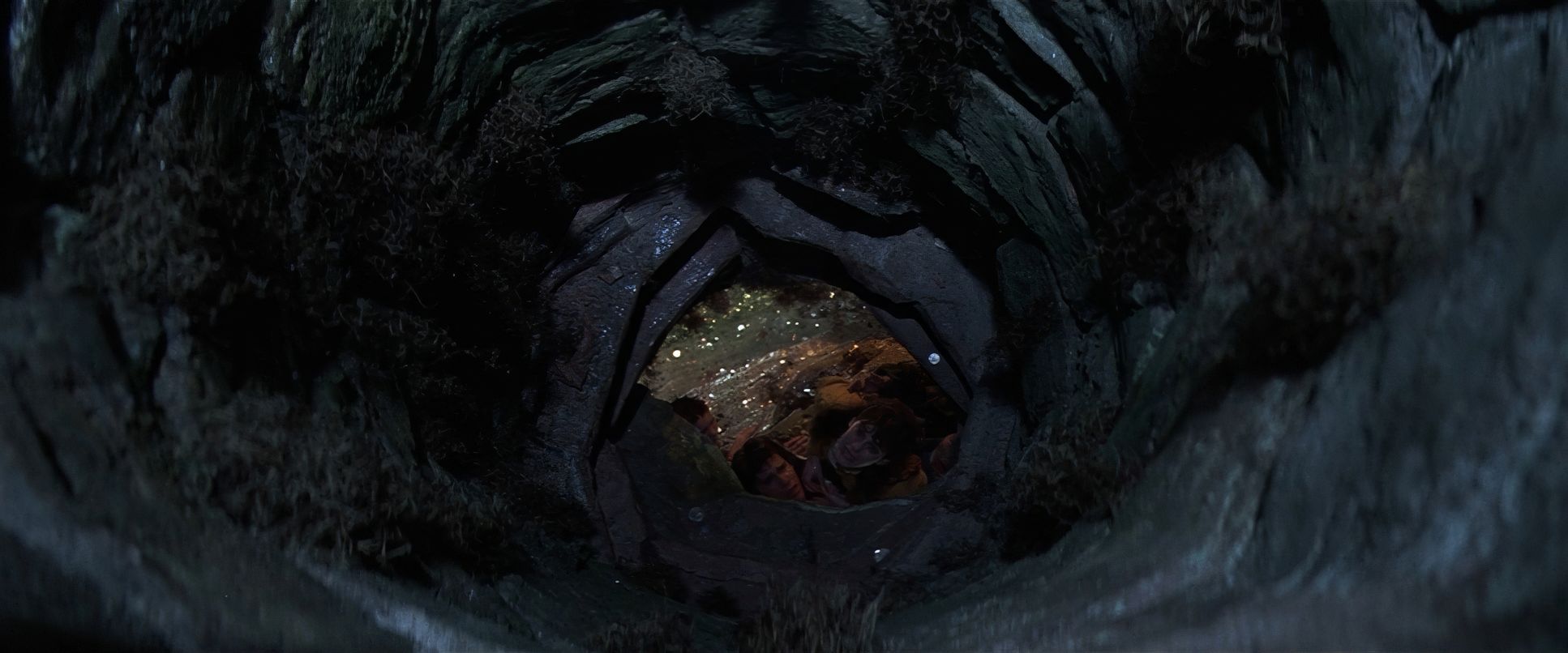 In the cave sequences, the lighting is almost entirely driven by flashlights and lanterns. As a colorist, I love the pockets of illumination here they let the frame fall into true, inky blacks. There’s a rawness to the lighting that makes the peril feel unmanufactured. The highlight roll-off from those practical flashlights on the 80s film stock is beautiful; it’s a gentle, organic transition that prevents the image from feeling “flat.” It’s a style that champions mood over visibility, forcing the audience to strain their eyes right along with the characters.