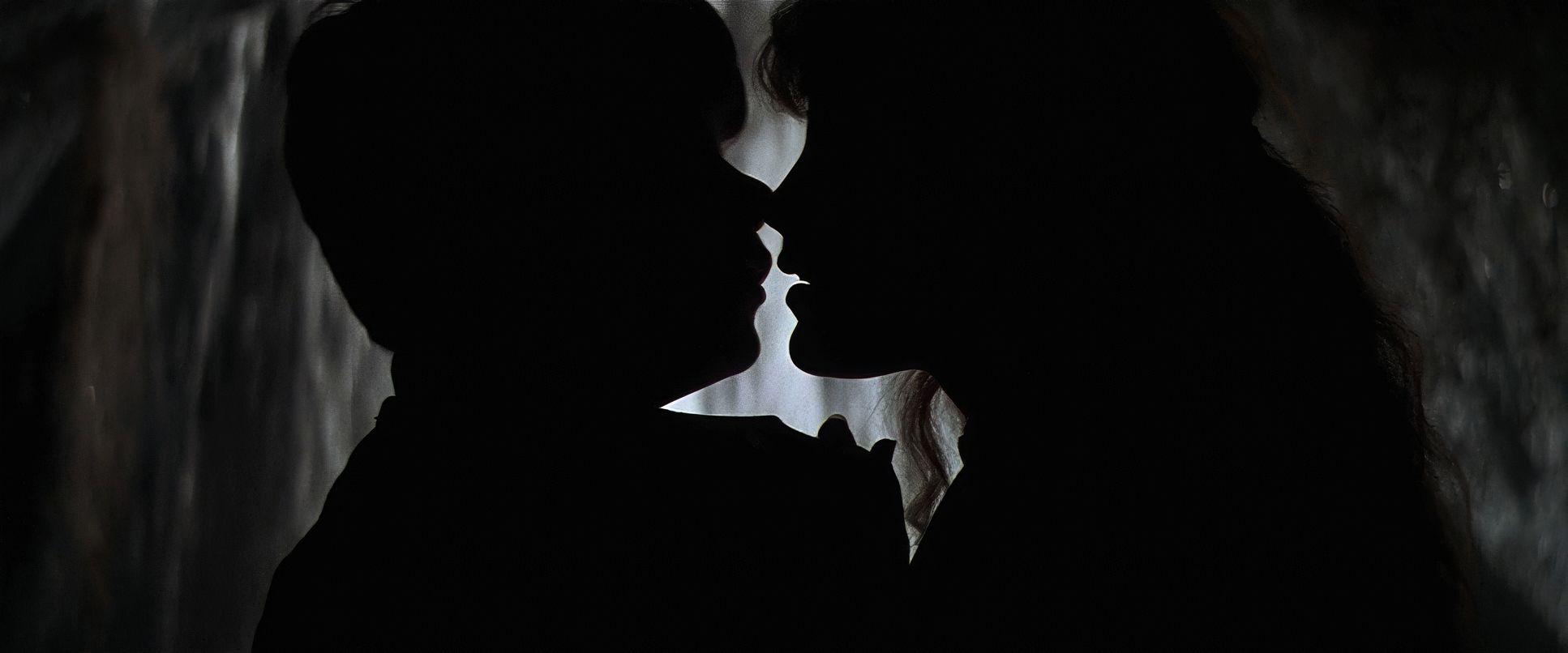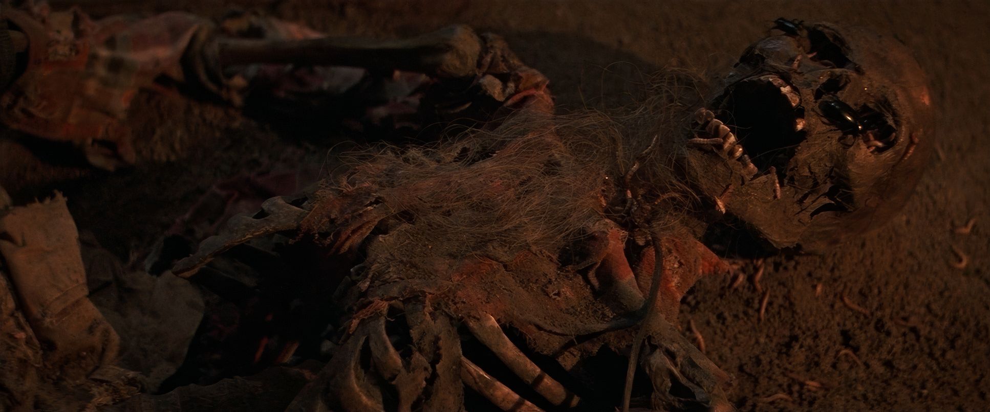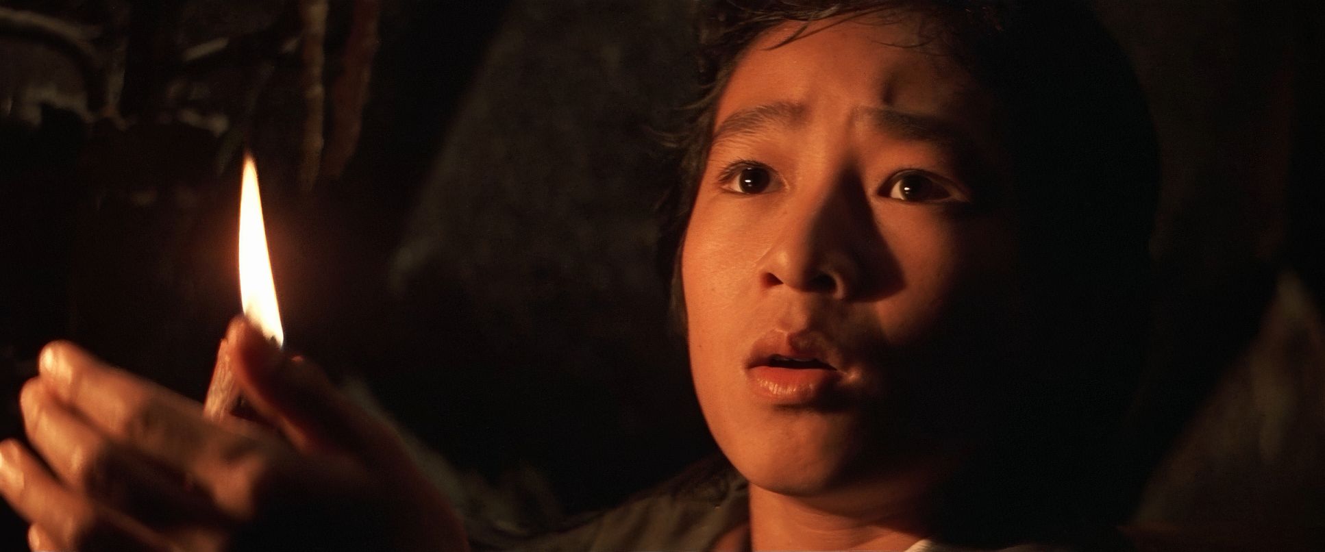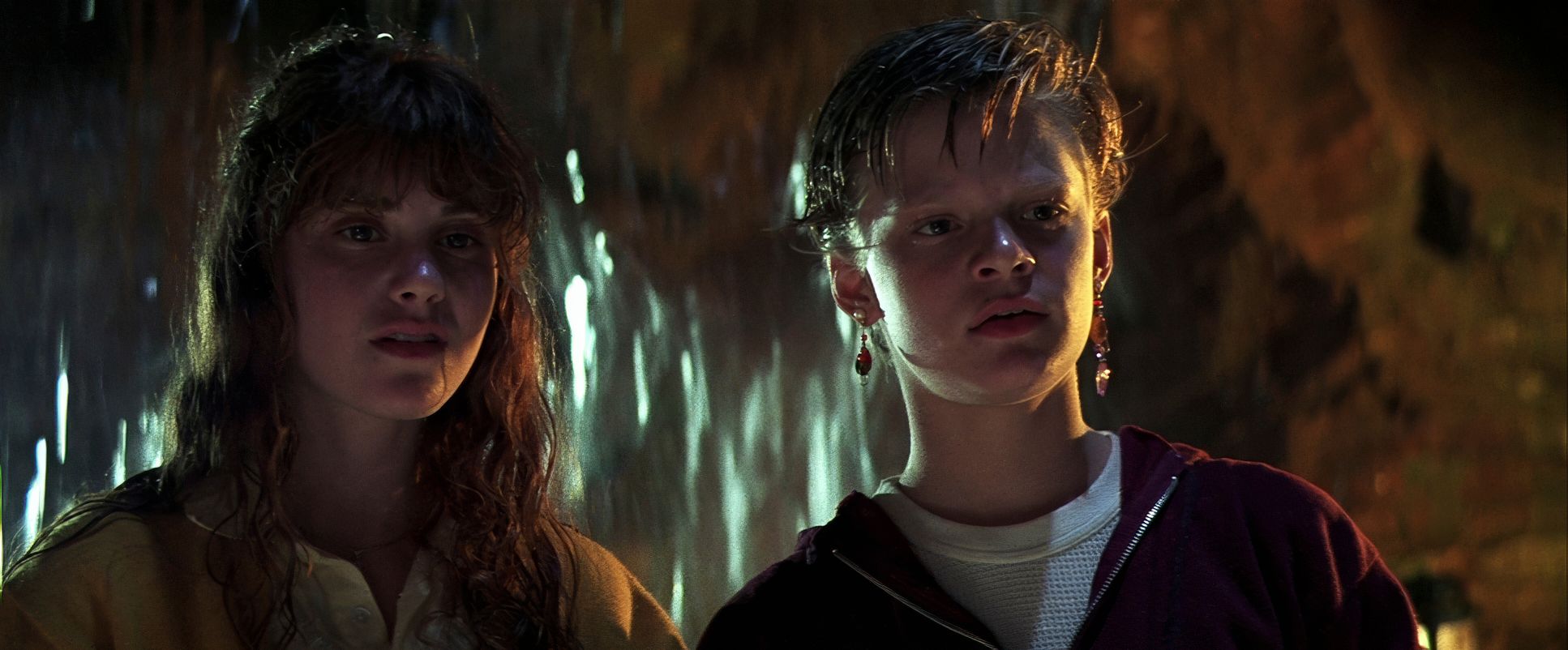 In the cave sequences, the lighting is almost entirely driven by flashlights and lanterns. As a colorist, I love the pockets of illumination here they let the frame fall into true, inky blacks. There’s a rawness to the lighting that makes the peril feel unmanufactured. The highlight roll-off from those practical flashlights on the 80s film stock is beautiful; it’s a gentle, organic transition that prevents the image from feeling “flat.” It’s a style that champions mood over visibility, forcing the audience to strain their eyes right along with the characters.
