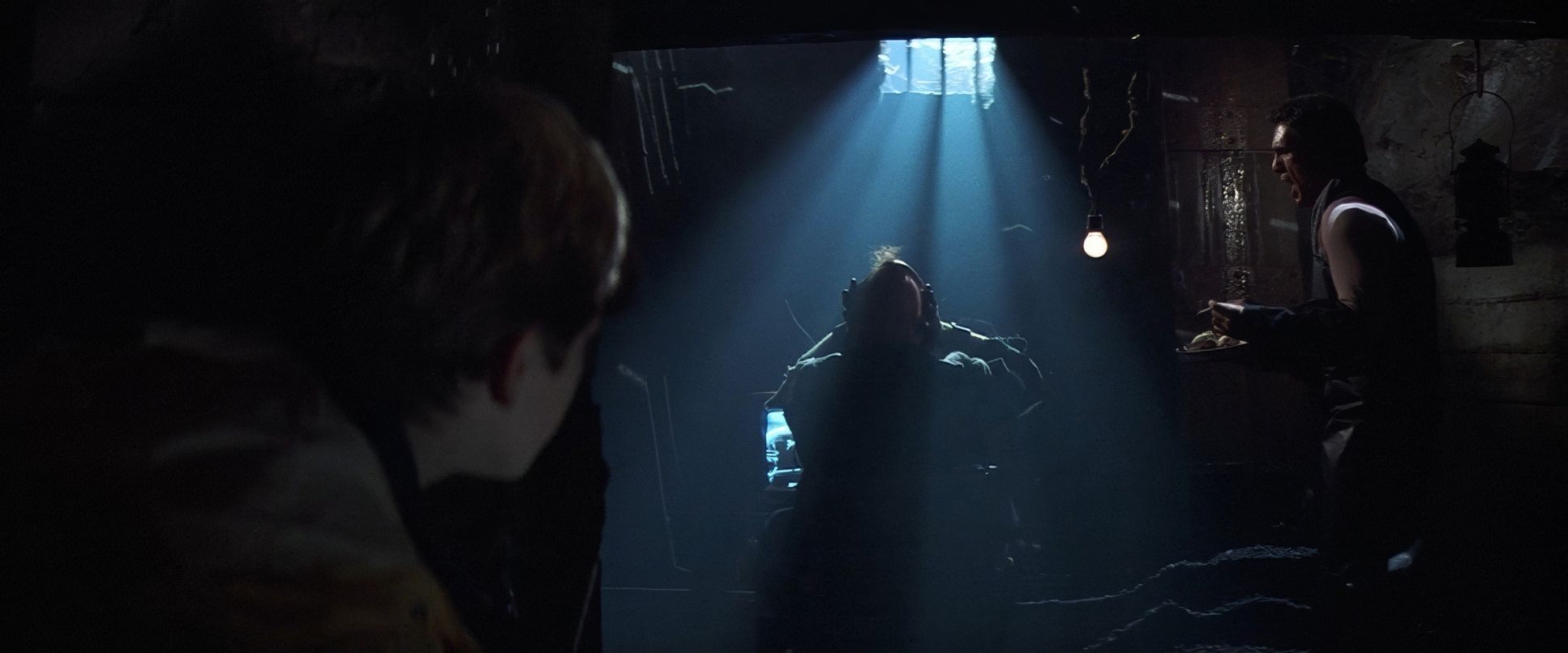 This is where the film’s dual nature really shows up. McLean and Donner weren’t afraid of the dark. The film moves from the overcast, naturalistic light of the Goon Docks into the high-contrast, grimy interiors of the restaurant, and finally into the “motivated” darkness of the caves.