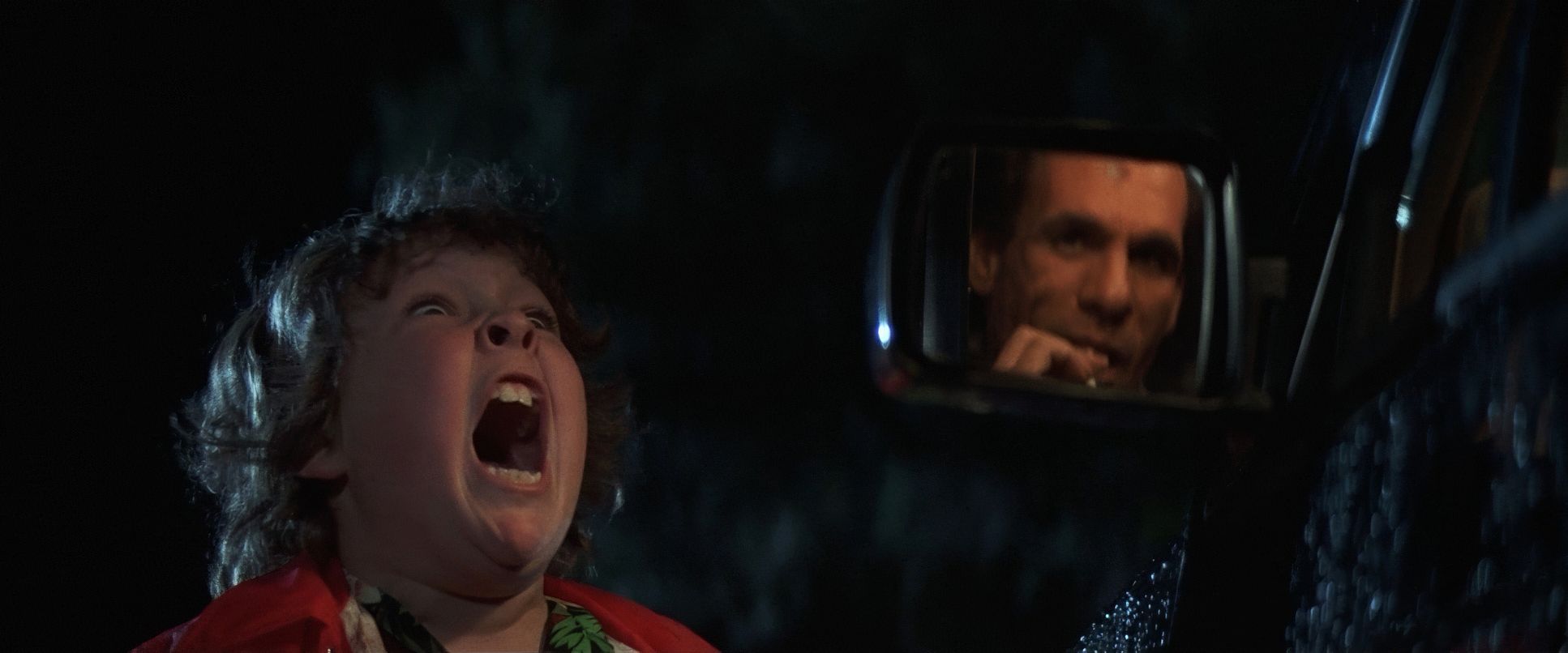 The blocking is where the character work happens. Mikey is almost always central or leading the pack. Data is often tinkering at the edges, and Chunk is frequently blocked as the outlier, physically separated for both comedic beats and his eventual emotional arc with Sloth. Their physical huddling against threats visually embodies the “Goonies never say die” mantra. It’s a masterclass in choreography managing eight kids and a group of villains in tight, subterranean sets without the visual ever feeling cluttered or confusing.