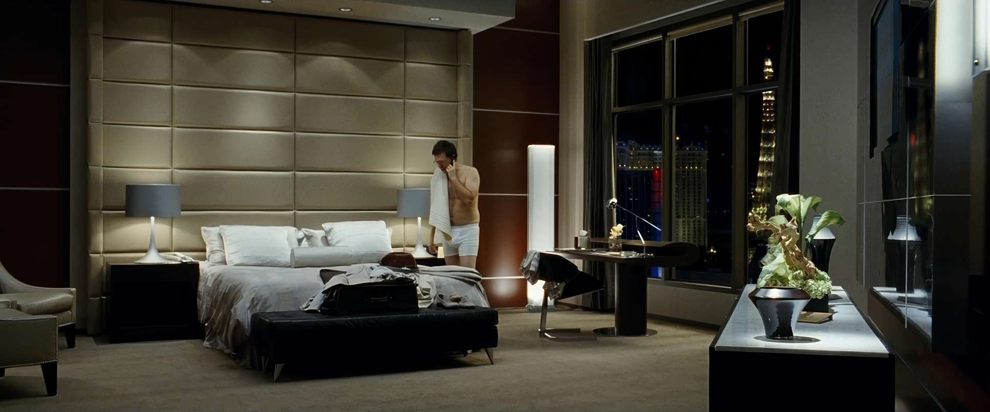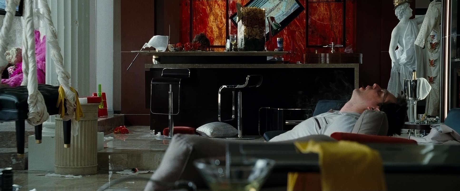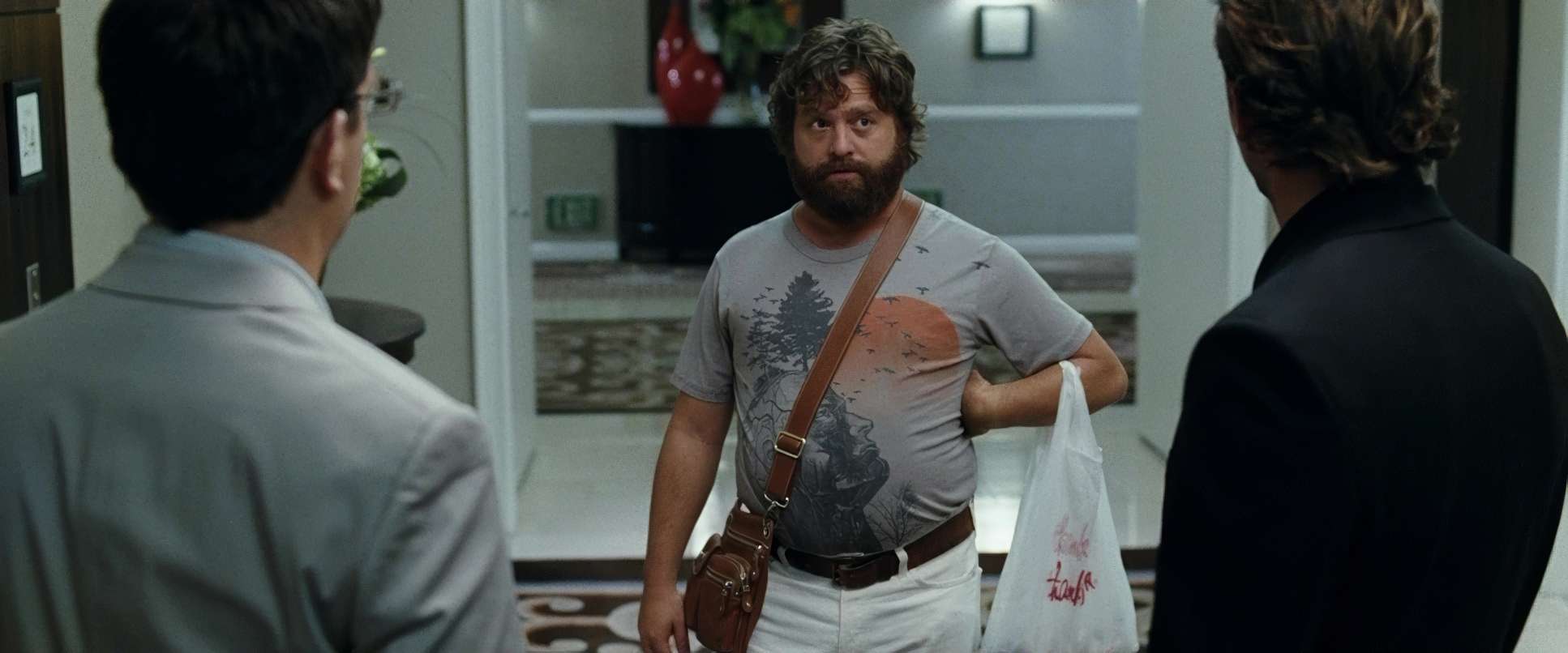 Despite the chaotic plot, the compositions are incredibly precise. Sher uses the 2.39:1 anamorphic-style frame to emphasize the “Wolfpack” as a unit. You’ll often see wide shots used to establish the scale of their mistakes, like the wide reveal of the trashed suite.