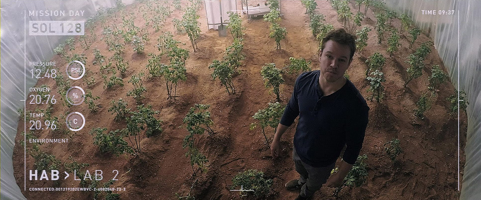 Inside the Hab, the composition shifts to medium shots and close-ups filled with clutter tools, screens, plants. This visual density reinforces the theme of “science-ing the shit” out of the problem. We are forced to look at what he is looking at.