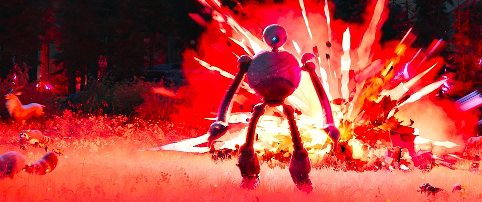 The core premise high-tech metal stranded in raw nature is a playground for visual contrast. The film’s look clearly draws from impressionist painting, prioritizing brushstrokes over pore-level detail. The visual development team avoided the trap of making a “dollar store WALL-E” by rooting the design in the chaotic textures of the forest.