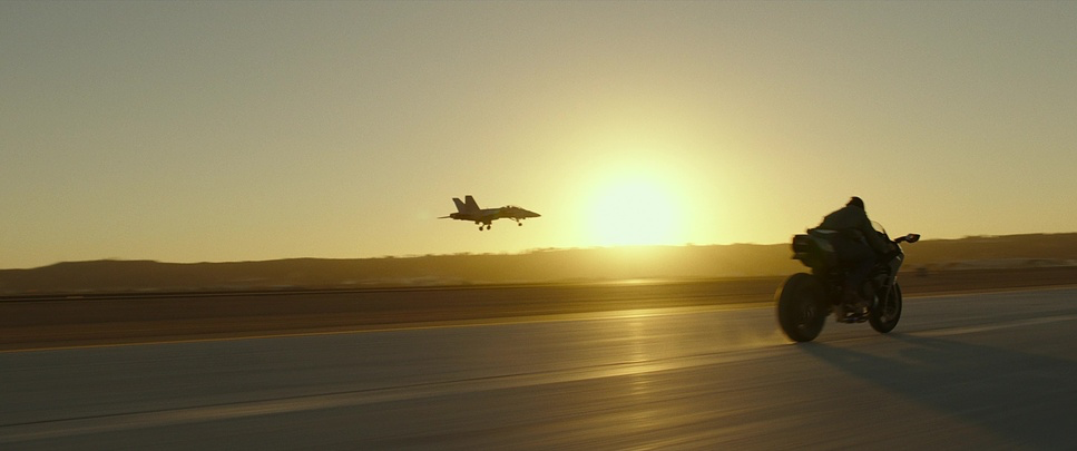The lighting here is overwhelmingly motivated because, at 20,000 feet, you can’t exactly set up a skypanel. The sun is your key light, and Miranda used it with absolute mastery. The team had to chart the sun’s path for every single flight to ensure continuity. We see a lot of backlighting and high-contrast scenarios, particularly in the low-level training runs through the canyons. The “warm, desaturated” look listed in the production notes comes alive here, with the golden hour sun flaring aggressively into the lens.