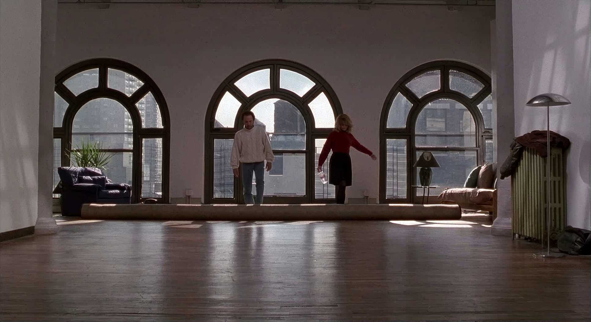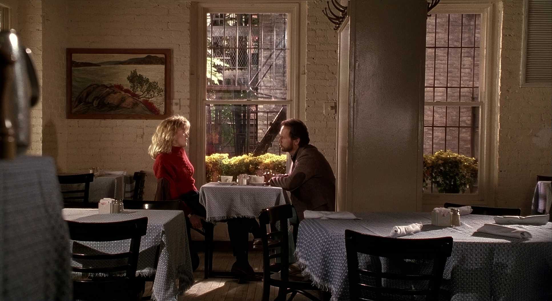 Interiors are filled with soft, diffused light from practical lamps. The key lights are broad, ensuring we can see every micro-expression on Meg Ryan or Billy Crystal’s faces. Then you have the exteriors—that legendary golden hour light. He likely used big diffusion frames and HMIs to mimic the sun filtering through the trees. It’s not just “pretty”; it’s functional. The lighting shifts from the crisp, high-contrast side light of a Chicago parking lot to the soft, overcast daylight of a New York winter, always maintaining a moderate contrast that avoids crushed blacks.